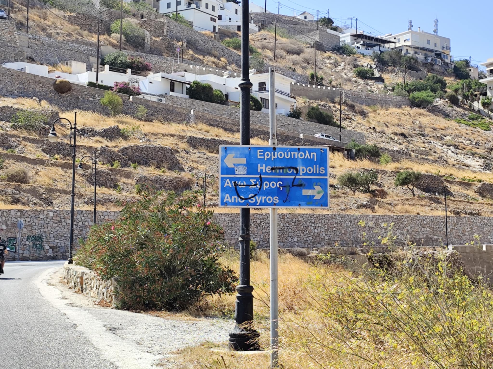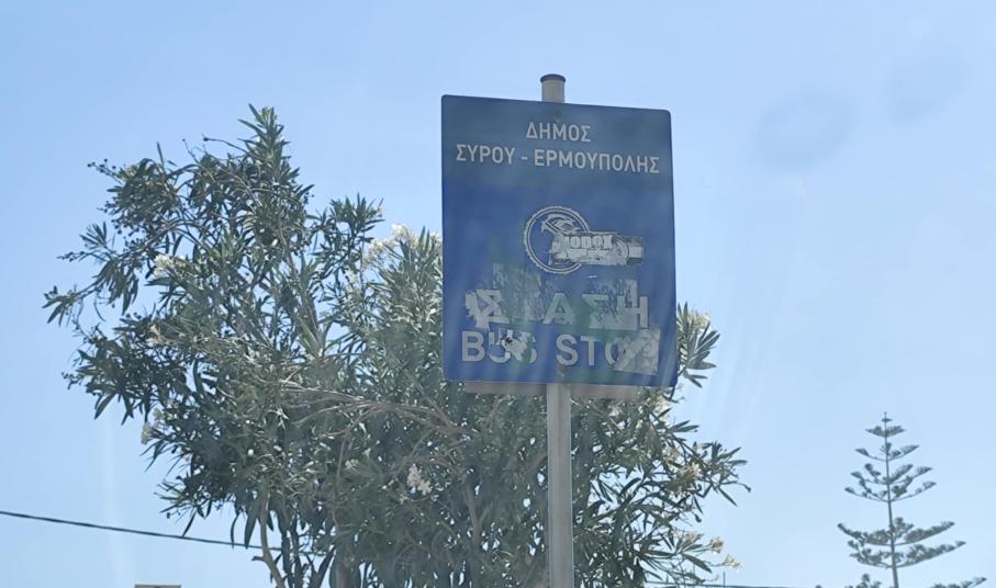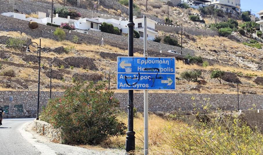 Βαμμένες, αποχρωματισμένες, με γκράφιτι και αυτοκόλλητα, πολλές από τις ενημερωτικές πινακίδες για κατοίκους κι επισκέπτες της Σύρου