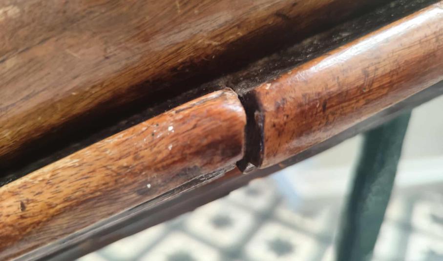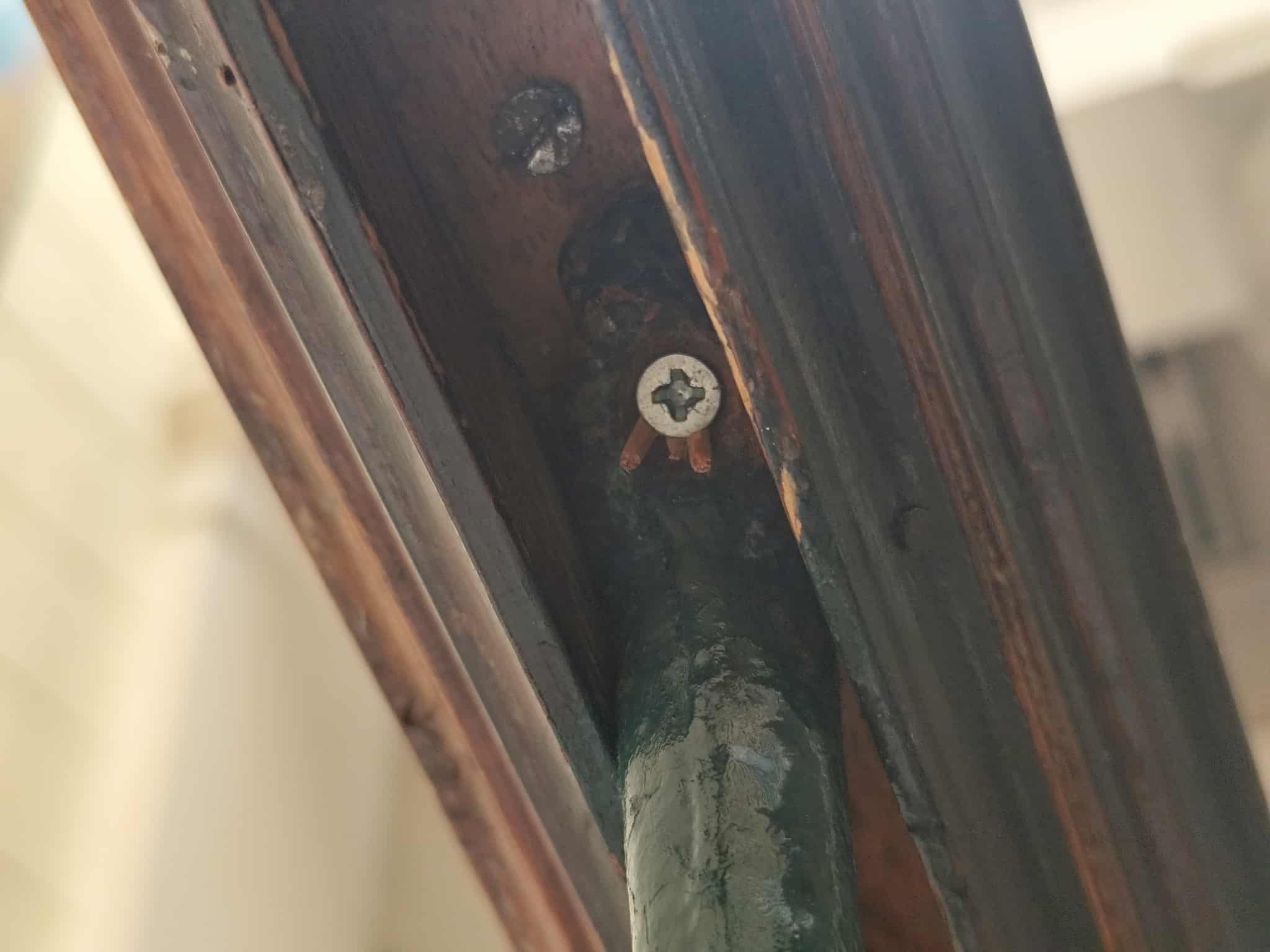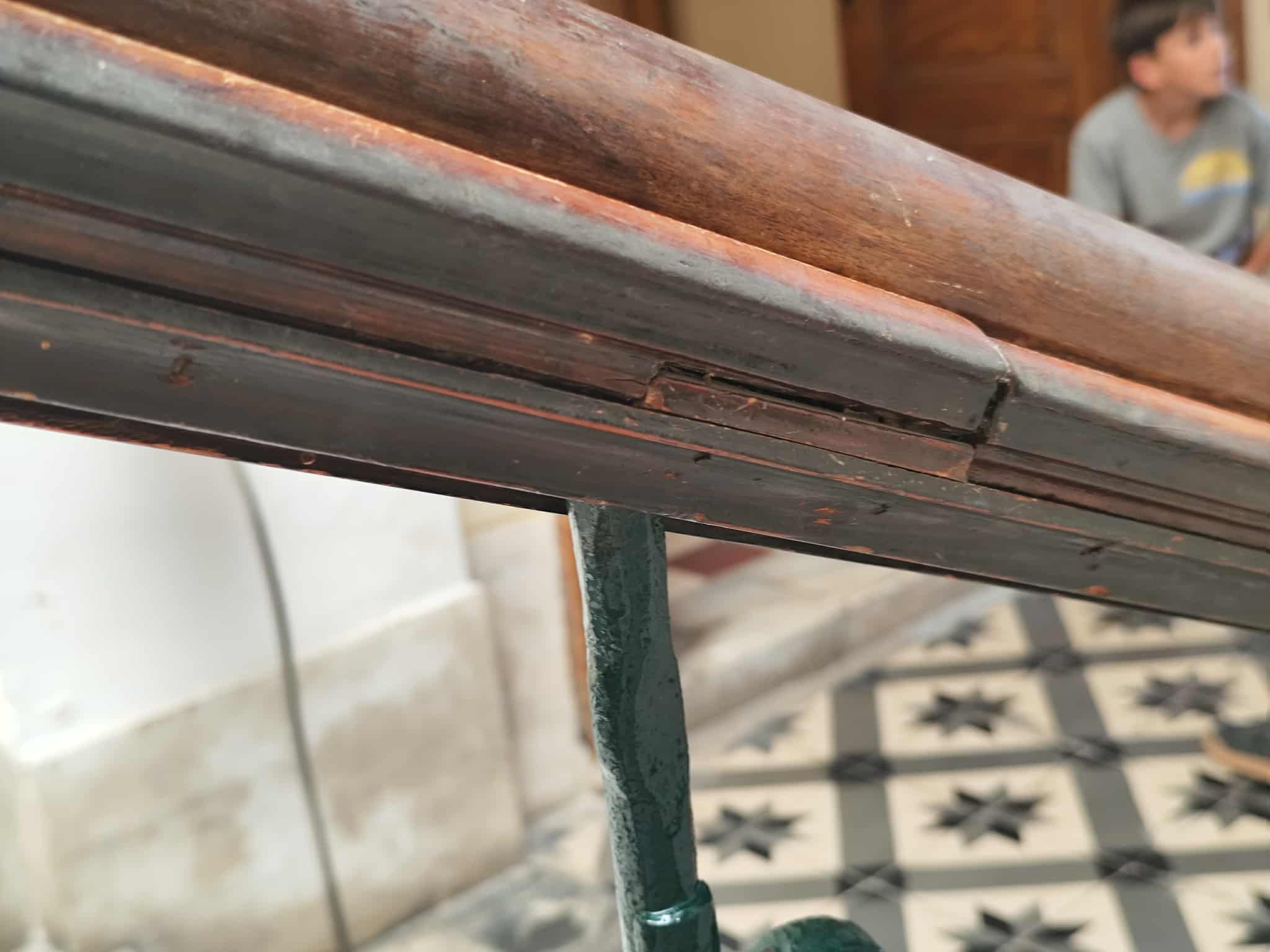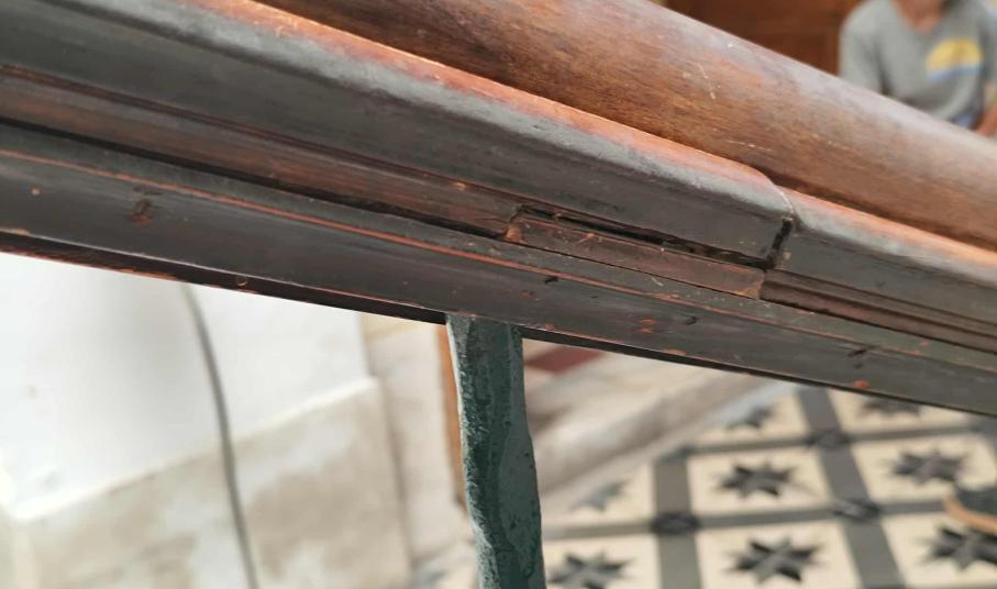Σύμφωνα με όσα φαίνονται στο φωτογραφικό υλικό, τα τμήματα της ξύλινης κουπαστής έχουν αποκολληθεί μεταξύ τους, ενώ ορισμένα είναι σπασμένα, όπως επίσης, αν και έχουν τοποθετηθεί τρεις νέες βίδες, κάτω από την κουπαστή, στο σύνολό τους, οι υπόλοιπες δεν είναι ικανές να κρατήσουν στη θέση του, το κάγκελο. Επιπλέον, η κουπαστή έχει κυρτώσει.