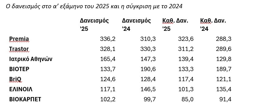 Σύμφωνα με την επεξεργασία των στοιχείων σε 71 εισηγμένες της Κύριας Αγοράς, οι οποίες δεν συμπεριλαμβάνονται στους δείκτες Υψηλής και Μεσαίας Κεφαλαιοποίησης του Χ.Α., ο συνολικός δανεισμός για το α’ εξάμηνο του 2025 (συμπεριλαμβανομένων και των υποχρεώσεων μίσθωσης) ανέρχεται σε 2,615 δισ. ευρώ και είναι μειωμένος κατά -5,6% ή κατά -157 εκατ. ευρώ σε σχέση με την αντίστοιχη επίδοση στο τέλος του 2024 (2,773 δισ. ευρώ).