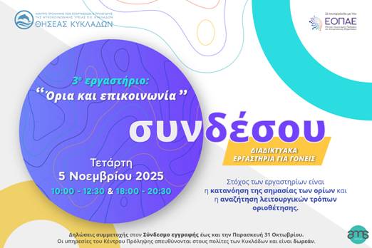 Για περισσότερες πληροφορίες, μπορείτε να ανατρέξετε στην ιστοσελίδα μας Διαδικτυακά Εργαστήρια για Γονείς με θέμα τα Όρια – ΘΗΣΕΑΣ ΚΥΚΛΑΔΩΝ