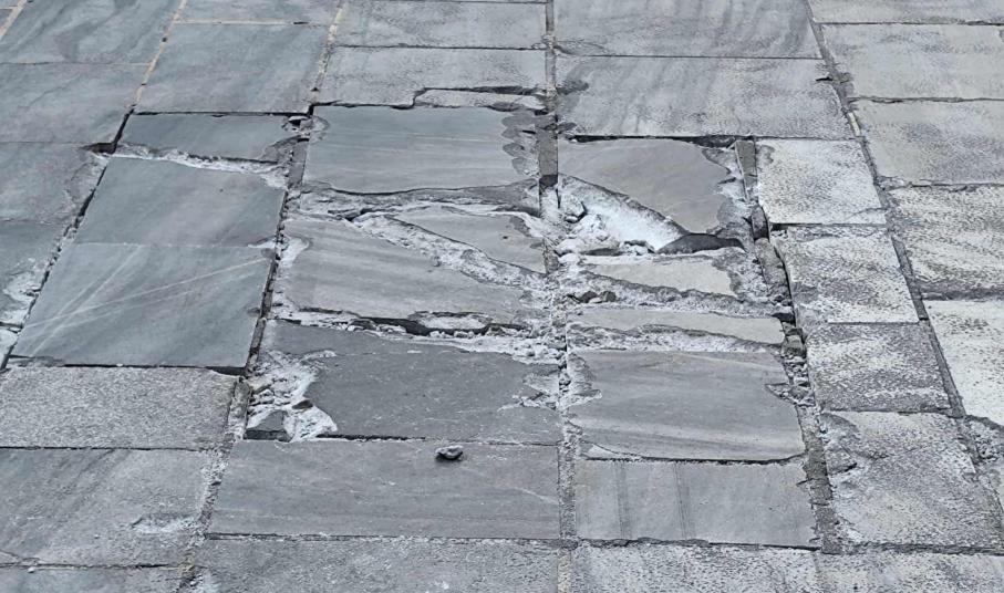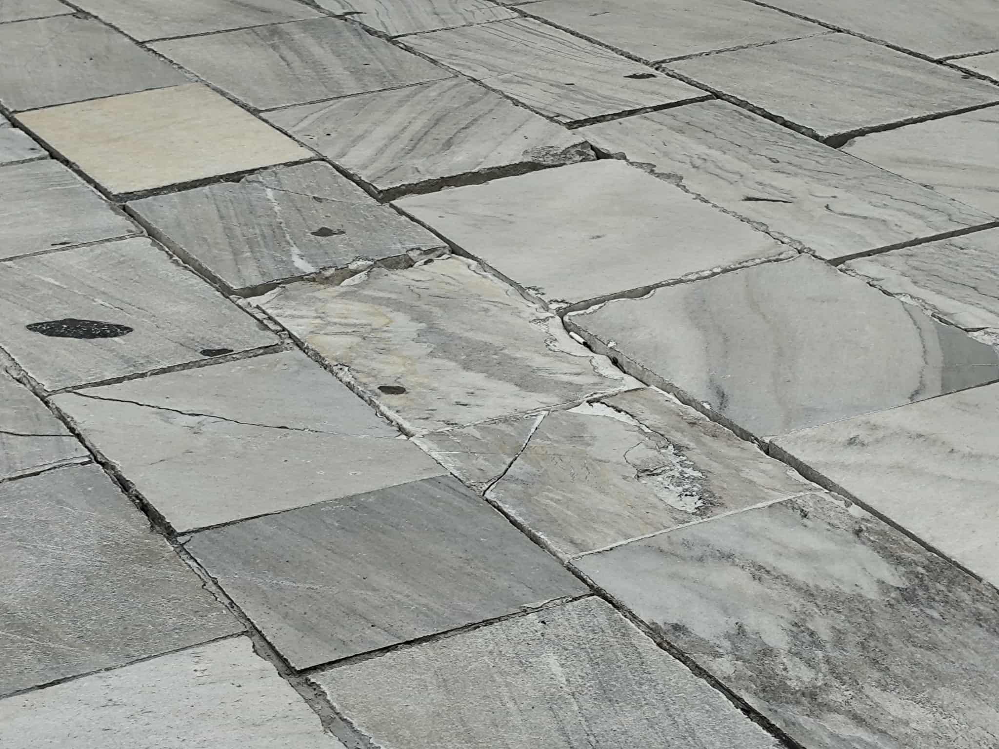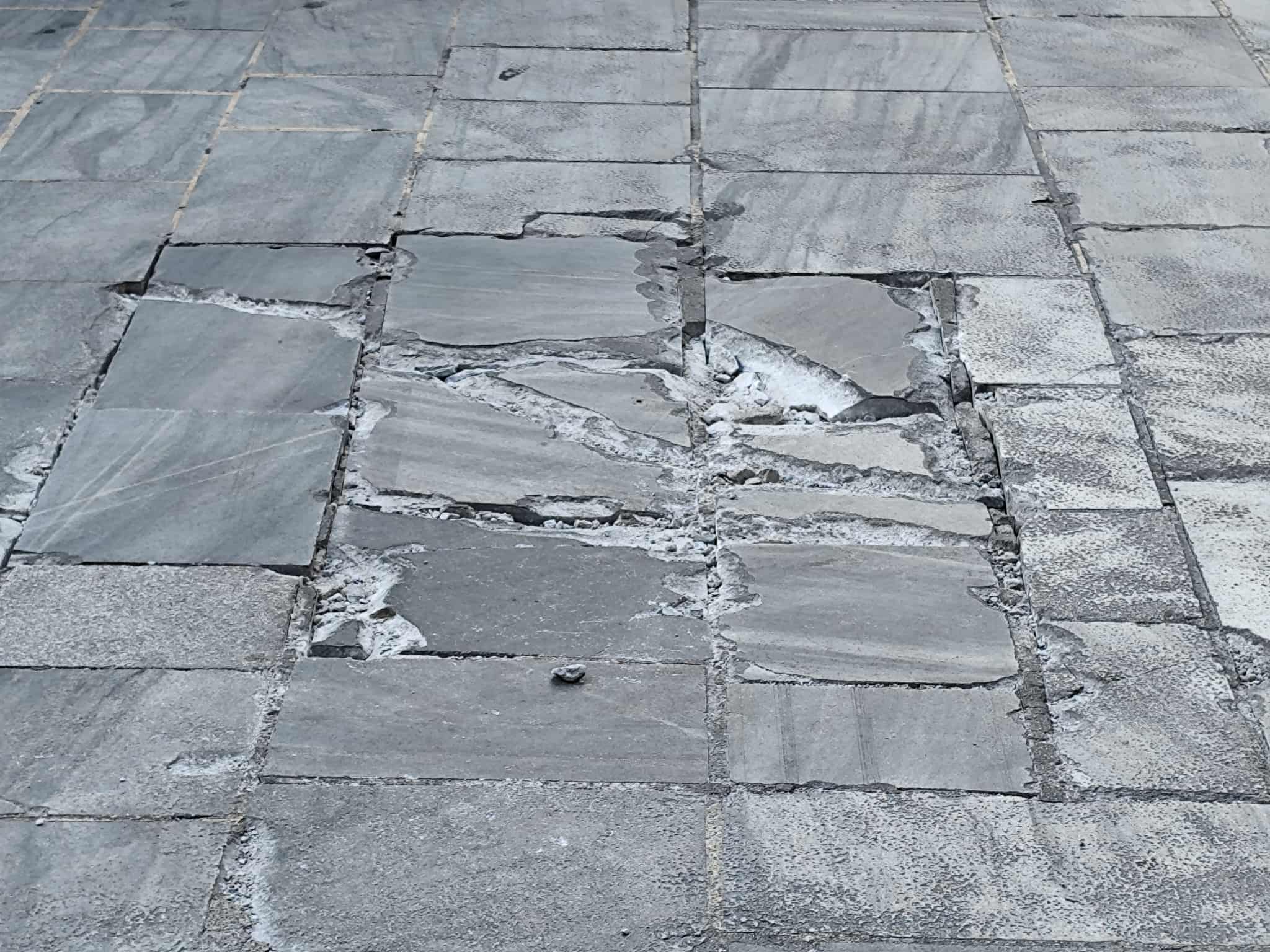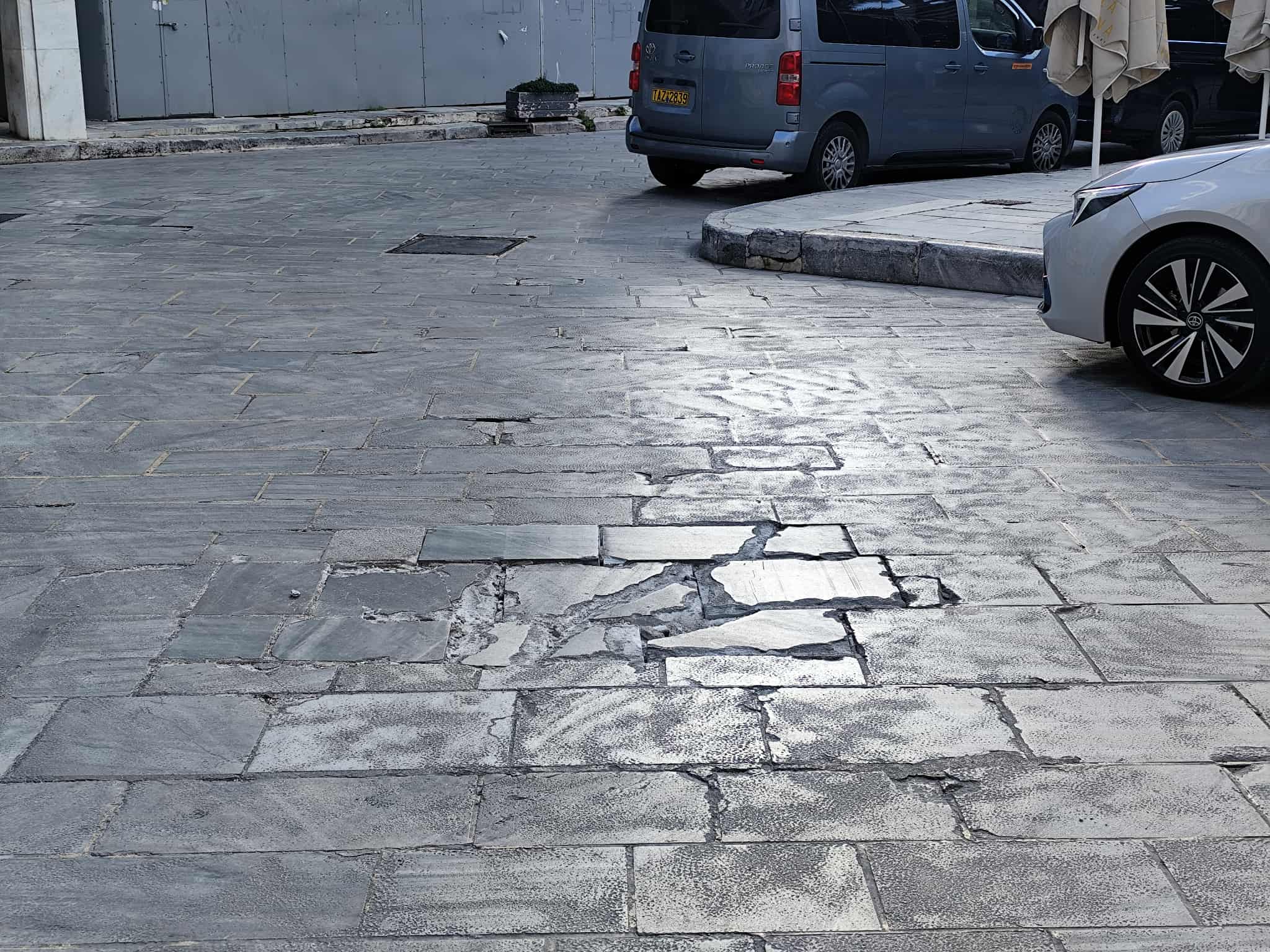 Όπως φαίνεται και στο φωτογραφικό υλικό της “Κοινής Γνώμης” μαρμάρινες πλάκες έχουν σπάσει ολοκληρωτικά, δημιουργώντας “παγίδες” τόσο για πεζούς, όσο και για οδηγούς μηχανών. Επιπλέον, μικρότερης έντασης αλλά αντίστοιχο πρόβλημα, παρατηρήθηκε και στην οδό Ελ. Βενιζέλου.