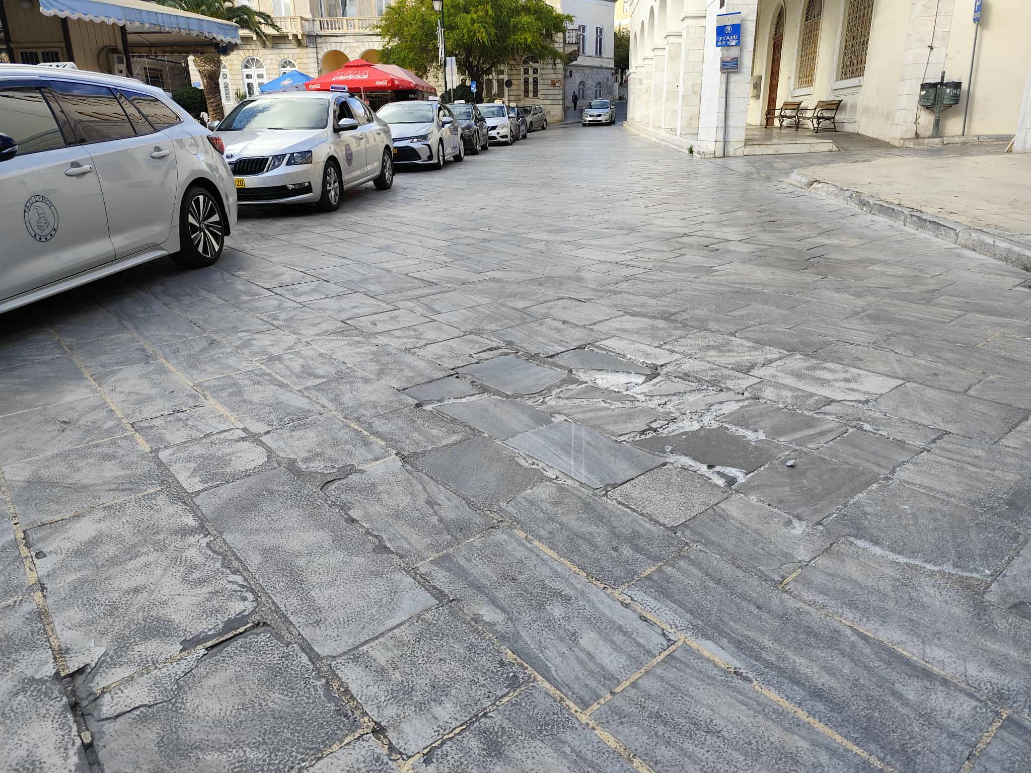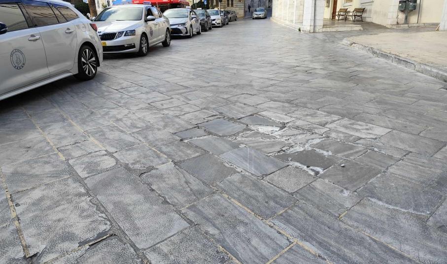 Φθορές φέρουν ξανά μαρμάρινες πλάκες στον κεντρικό δρόμο, περιμετρικά της πλατείας Μιαούλη και κοντά στο ύψος που σταθμεύουν τα ταξί, αφού τελικά, οι εργασίες αποκατάστασης που υπήρξαν, δεν άντεξαν παρά μόνο για λίγες εβδομάδες.