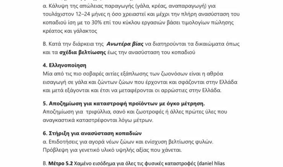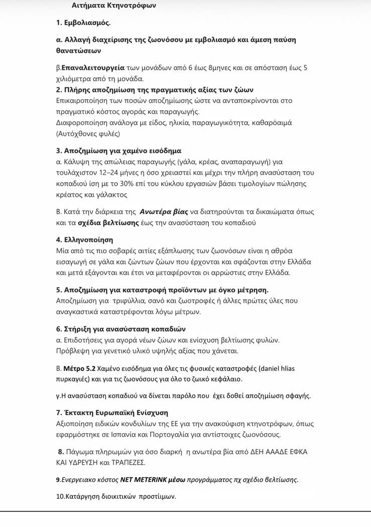 ΕΥΛΟΓΙΑ στην κτηνοτροφία με εμβολιασμό των ζώων, πλήρη αποζημίωση για τα θανατωμένα ζώα, αναπλήρωση του χαμένου εισοδήματος, δωρεάν ανασύσταση των κοπαδιών. Να υπάρχει αποζημίωση για τον καταρροϊκό πυρετό.