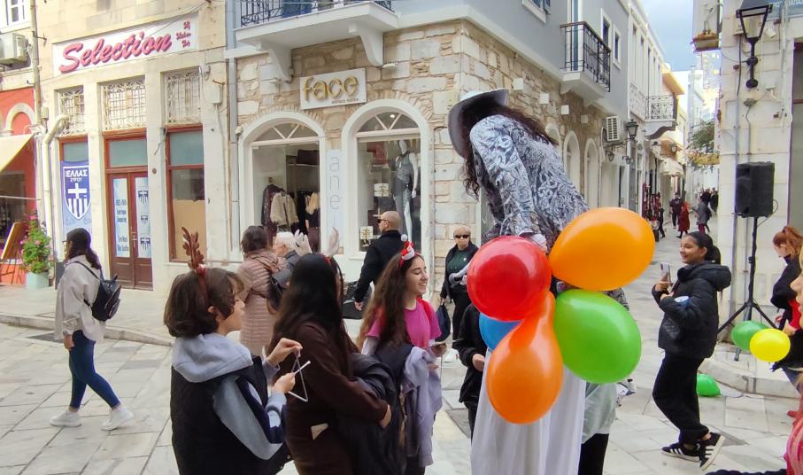 Συγκεκριμένα, ο κεντρικός πεζόδρομος έχει γεμίσει από παιδικές φωνές που τραγουδούν τα κάλαντα, ενώ καθ΄ όλη τη διάρκεια του πρωινού παίζουν εορταστικά τραγούδια. Παράλληλα, ένας πανέμορφος ξυλοπόδαρος συνομιλεί με τα μικρά παιδιά, ανταλλάσσοντας ευχές για υγεία, αγάπη και ευτυχία.