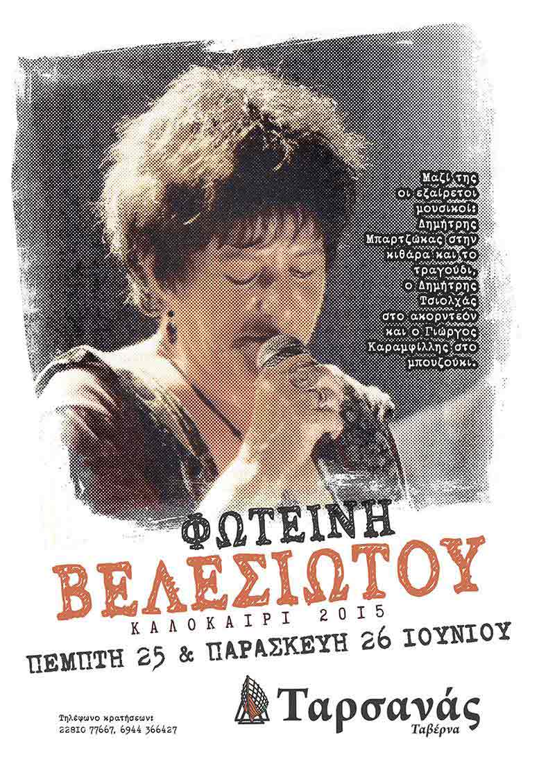 Την κα Φωτεινή Βελεσιώτου μυστικό αστέρι του λαϊκού τραγουδιού με την αισθαντική βραχνάδα η οποία συγκινεί και μιλά κατευθείαν στην καρδιά του κοινού, υποδέχεται σήμερα και αύριο ο “Ταρσανάς”.