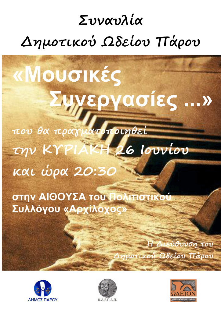 Την Κυριακή 26 Ιουνίου και ώρα 20:30 θα πραγματοποιηθεί η συναυλία του Δημοτικού Ωδείου Πάρου, με τίτλο «Μουσικές Συνεργασίες», στην αίθουσα του Πολιτιστικού Συλλόγου «Αρχίλοχος».