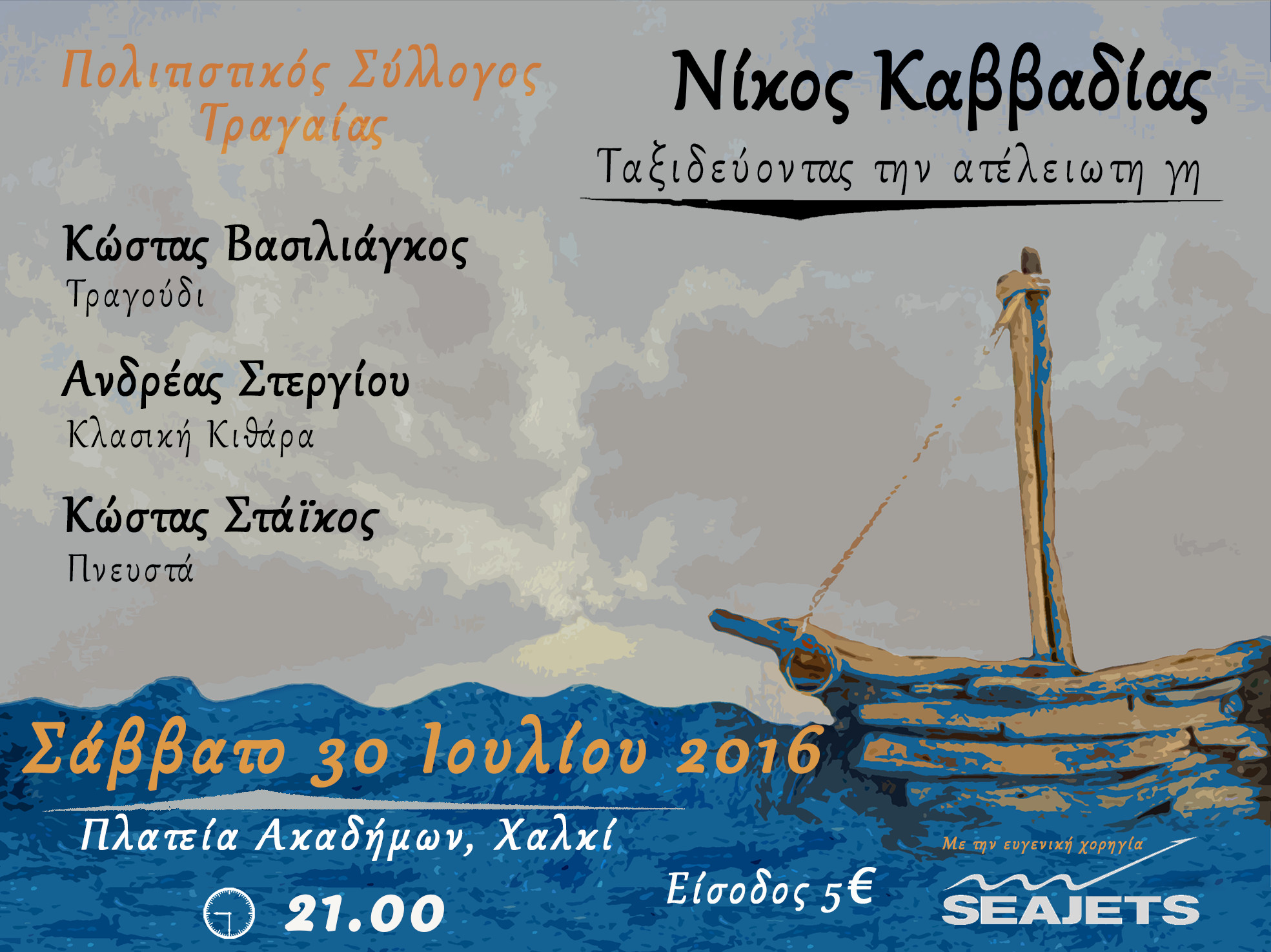 Αφιέρωμα στον ποιητή Νίκο Καββαδία με τίτλο “Ταξιδεύοντας την ατέλειωτη γη” παρουσιάζει το Σάββατο 30 Ιουλίου 2016 και ώρα 21:00 στην πλατεία Ακαδήμων στο Χαλκί, ο Πολιτιστικός Σύλλογος Τραγαίας.
