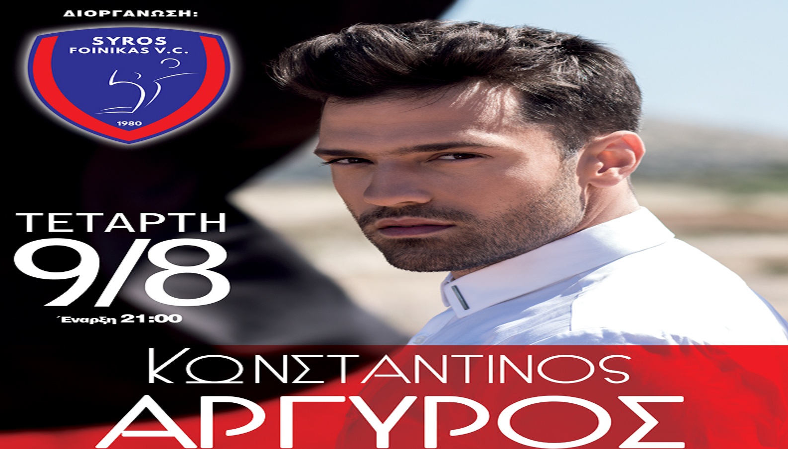Ο Κωνσταντίνος Αργυρός έρχεται για πρώτη φορά στην ΣΥΡΟ για ένα και μοναδικό μαγικό βράδυ. Την Τετάρτη 9 Αυγούστου ο Κωνσταντίνος Αργυρός θα βρεθεί στον Χώρο Πολιτισμού "Μάνος Ελευθερίου" στην Σύρο στις 21:00 και έρχεται για να μας παρουσιάσει ένα εντυπωσιακό live, με ένα άρτια δομημένο πρόγραμμα απ' την προσωπική του δισκογραφία αλλά και με τραγούδια που έχουμε αγαπήσει!