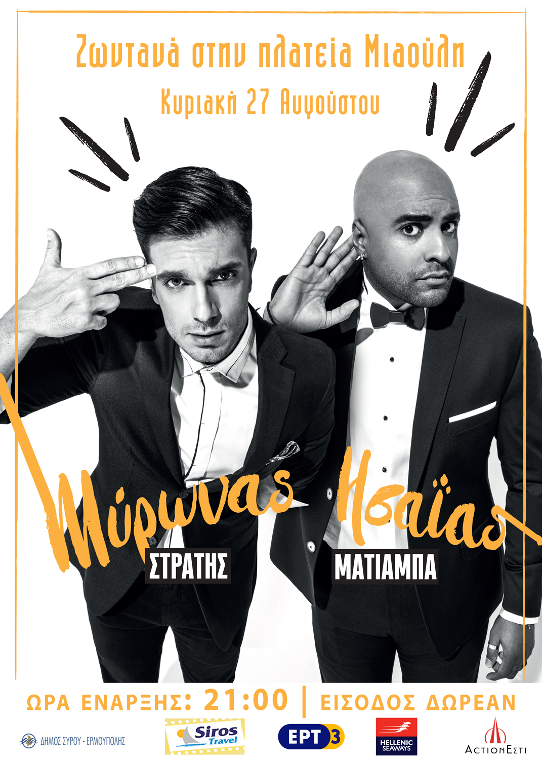 Ο Μύρωνας Στρατής και ο Ησαίας Ματιάμπα συναντά ο καθένας με την δική του ξεχωριστή προσωπικότητα και οι δύο μαζί, ανακαλύπτοντας τις κοινές μουσικές τους αγάπες, παρουσιάζουν ένα κεφάτο, εξαντλητικό, νεανικό πρόγραμμα για όλες τις ηλικίες με θέα το μαγευτικό Δημαρχείο της Σύρου.