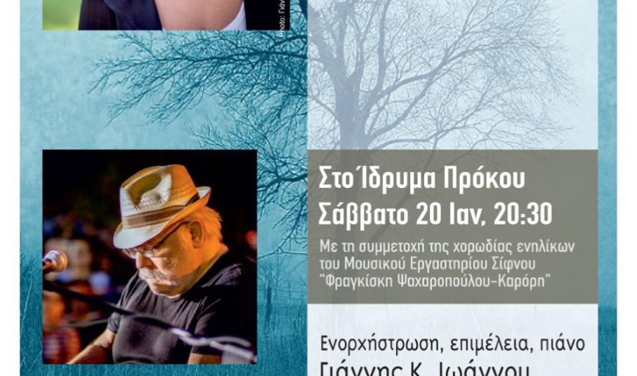 Ο Πολιτιστικός Σύλλογος Σίφνου, εγκαινιάζοντας το πρόγραμμα της νέας χρονιάς, έχει την ιδιαίτερη τιμή να φιλοξενεί στη Σίφνο  την εξαιρετική και αγαπημένη ερμηνεύτρια κ. Καλλιόπη Βέττα  και δυο ακόμα καταξιωμένους μουσικούς: το  συνθέτη, ενορχηστρωτή & πιανίστα κ. Γιάννη Κ. Ιωάννου, καθώς και το δεξιοτέχνη βιολιστή κ. Κυριάκο Γκουβέντα.