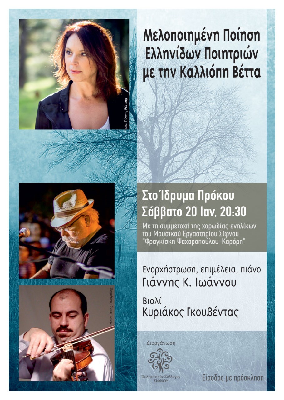 Σας περιμένουμε το Σάββατο 20.1.2018, ώρα 20:30, στο Ίδρυμα Πρόκου στην Απολλωνία, σε μια βραδιά μελοποιημένης ποίησης Ελληνίδων Ποιητριών και όχι μόνον...
