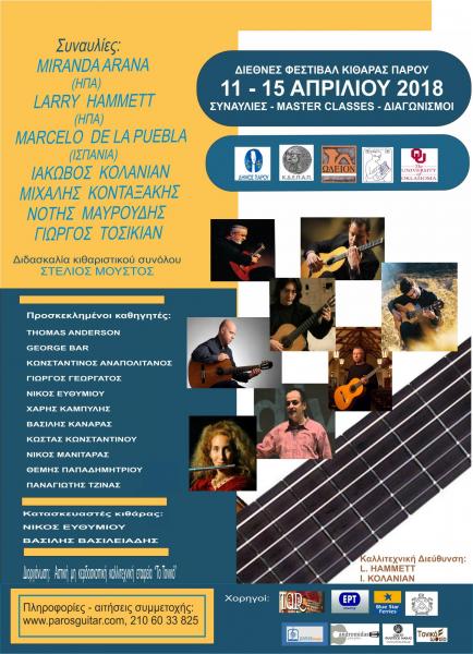 Στο Διεθνές Φεστιβάλ Κιθάρας Πάρου υπό την καλλιτεχνική διεύθυνση των Larry Hammett και Ιάκωβου Κολανιάν θα διδάξουν καταξιωμένοι σολίστ από την Ελλάδα και το εξωτερικό (Τhomas Anderson (ΗΠΑ), Κωνσταντίνος Αναπολιτάνος, Γιώργος Γεωργάτος, Χάρης Καμπύλης, Βασίλης Καναράς, Κώστας Κωνσταντίνου, Νίκος Μανιταράς, Γιώργος Μπαρμπαρέκος, Θέμης Παπαδημητρίου, Παναγιώτης Τζίνας, Βασίλης Ράπτης).