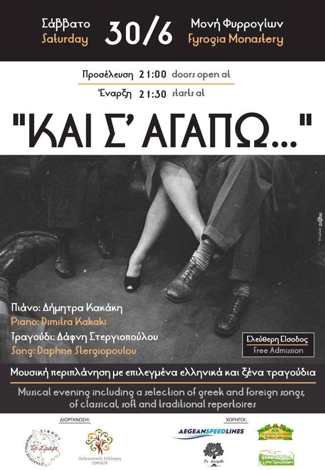 Η Δάφνη Στεργιοπούλου στο τραγούδι και η Δήμητρα Κακάκη στο πιάνο ερμηνεύουν επιλεγμένα ελληνικά και ξένα τραγούδια που μιλούν για την αγάπη, το μυστήριο, την χαρά, τον έρωτα…. Κομμάτια κλασσικού, ελαφρού και ρετρό ρεπερτορίου, συνδυασμένα με δημιουργήματα τοπικών προφορικών παραδόσεων, σκέψεις και στίχους. «Και σ’ αγαπώ», μία πρόταση για μουσική περιπλάνηση,  το Σάββατο 30 Ιουνίου στην Μονή Φυρρογίων, στη Σίφνο. Ερωτικό, Χρυσαλιφούρφουρο, Setum’ ami, Απόψε τα μεσάνυχτα, Ποιος είν’ τρελός από έρωτα, Περνοδιαβαίνω για να δω, Χάρτινο το φεγγαράκι, Lahistoriadeunamor, Ζητάτε να σας πω, Lavieenrose, Χαράματα η ώρα τρεις… κι άλλες πολλές, αγαπημένες μελωδίες!