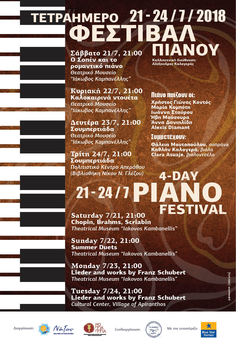 Το ερχόμενο Σάββατο αρχίζουμε τις εκδηλώσεις του φετινού καλοκαιριού με ένα τετραήμερο φεστιβάλ πιάνου.  Επισυνάπτω την αφίσα που έχει τις αναγκαίες πληροφορίες.  Κάθε μέρα θα είναι διαφορετικό το πρόγραμμα.  Τρείς μέρες στη Χώρα και η τέταρτη στην Απείρανθο.