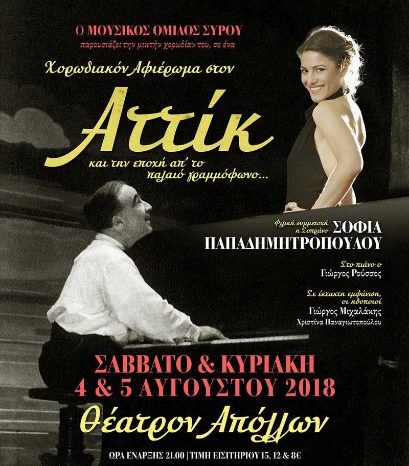 Στις 4 και 5 Αυγούστου 2018, η σοπράνο Σοφία Παπαδημητροπούλου και η μικτή χορωδία του Μουσικού Ομίλου θα παρουσιάσουν στο Θέατρο Απόλλων, μεγάλες επιτυχίες των Αττίκ, Σουγιούλ, Γιαννίδη και άλλων συνθετών της εποχής του «γραμμόφωνου» με τη συνοδεία του διακεκριμένου πιανίστα, Γιώργου Ρούσσου.