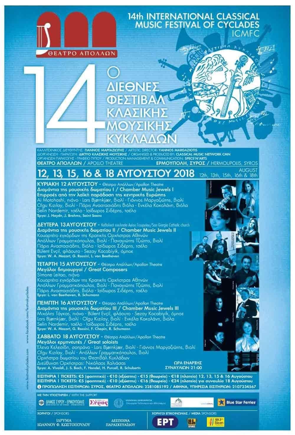 Το πρόγραμμα του 14ου Διεθνούς Φεστιβάλ Κλασικής Μουσικής Κυκλάδων ολοκληρώνεται το Σάββατο 18 Αυγούστου 2018 με τη Festival chamber music orchestra και τη σοπράνο Έλενα Κελεσίδη. Θα ακουστούν τα έργα: Concerti grossi - A. Vivaldi, κοντσέρτα για βιολί - J.S. Bach και άριες των F. Händel, H. Purcell, R. Schubert (Salve Regina).