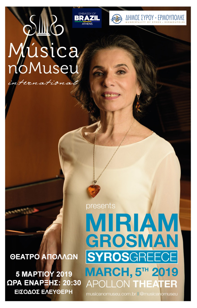 Στο πλαίσιο του Συριανού Καρναβαλιού «Γεώργιος Σουρής» 2019, ο Δήμος Σύρου- Ερμούπολης, σε συνδιοργάνωση με την Πρεσβείας της Βραζιλίας, παρουσιάζουν ένα ρεσιτάλ πιάνου MIRIAM GROSMAN στο Θέατρο Απόλλων, την Τρίτη 5 Μαρτίου 2019 και ώρα 20:30.