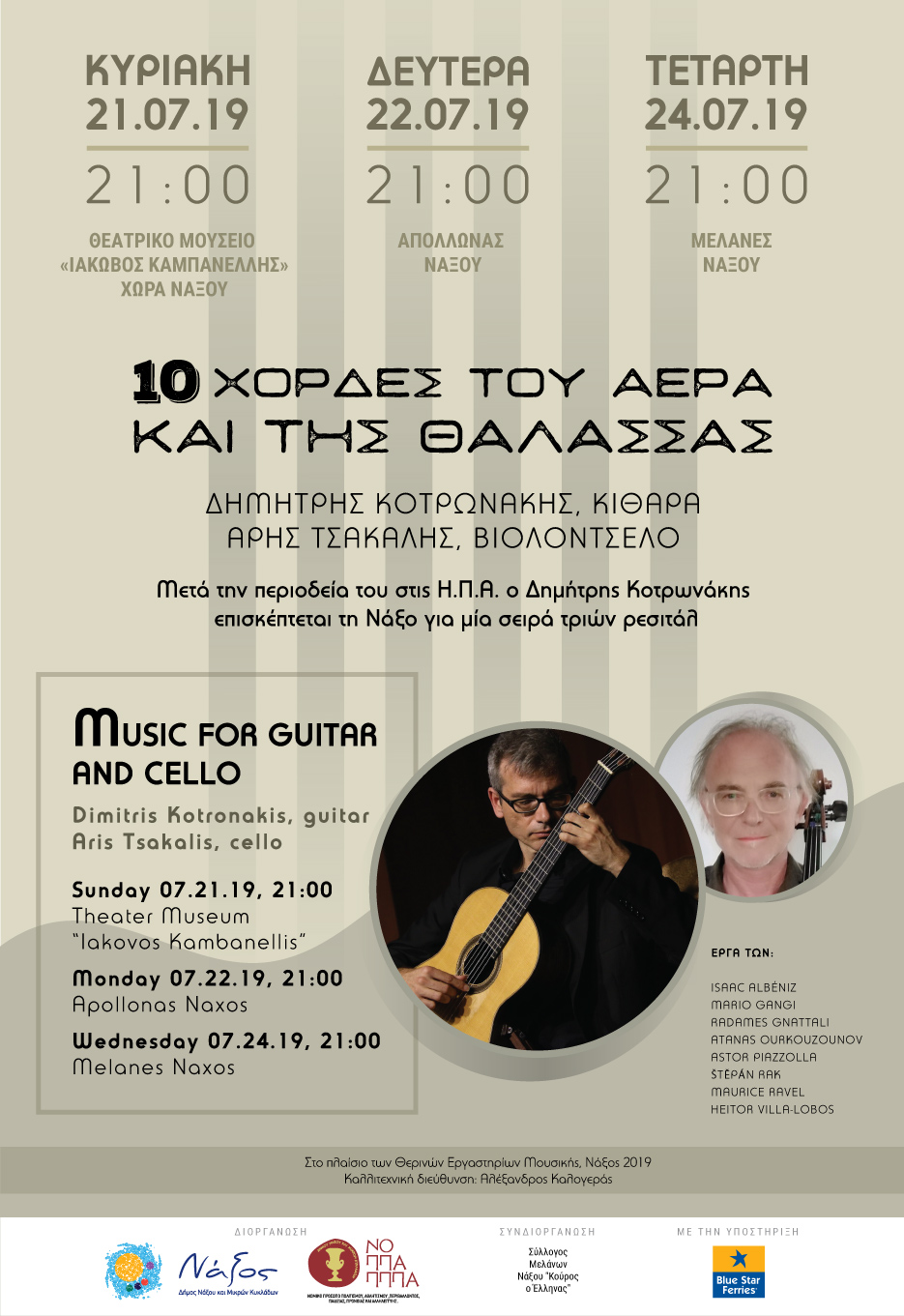 Ο Δημήτρης Κοτρωνάκης, ένας απο τους πλέον επιφανείς Έλληνες κιθαριστές με διεθνή καριέρα, μετά τη φετινή περιοδεία του στις Η.Π.Α. συνεργάζεται με τον τσελίστα Άρη Τσακάλη και μαζί έρχονται στη Νάξο για τρία ρεσιτάλ.