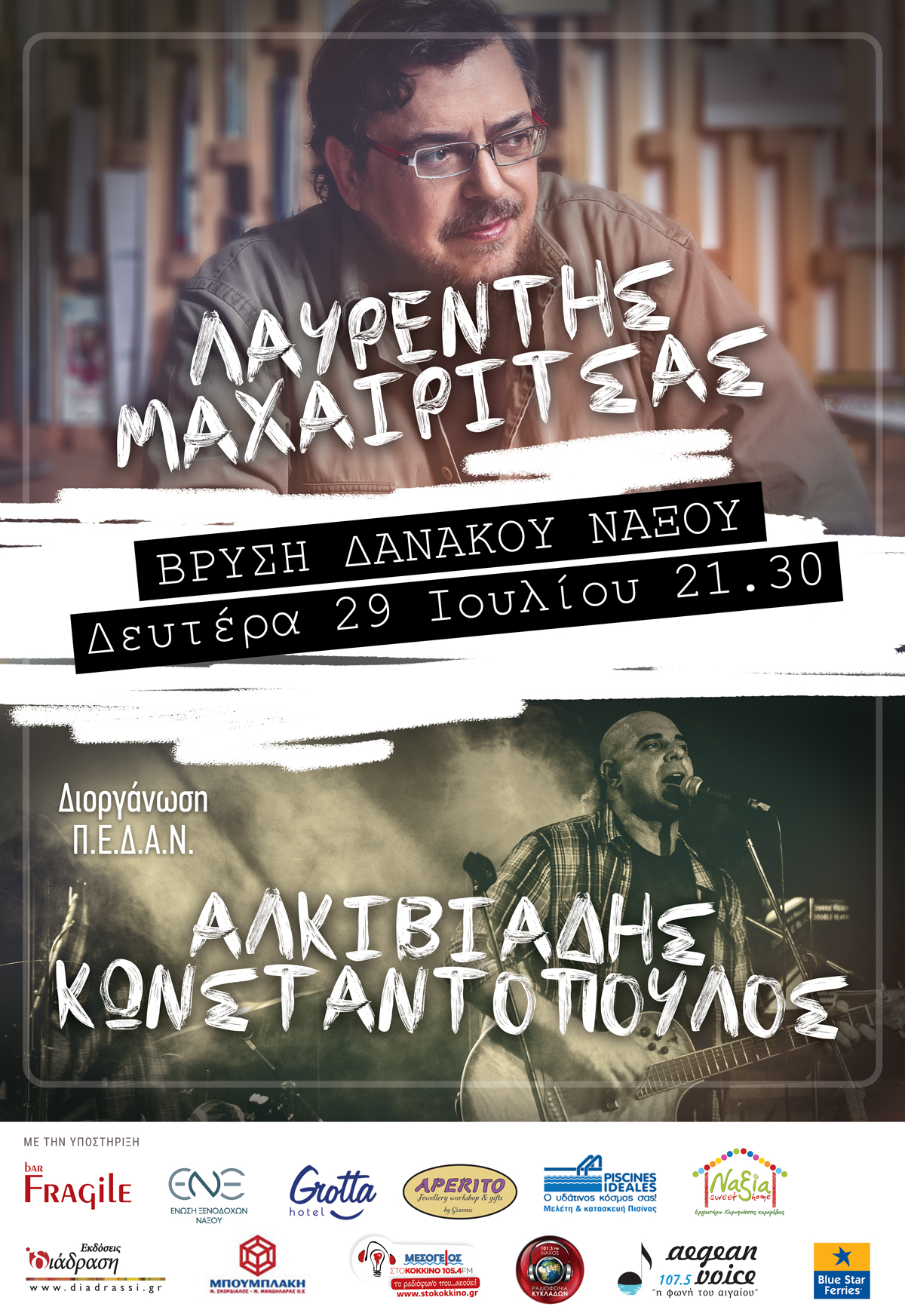 Τη Δευτέρα 29 Ιουλίου, στις 9.30 μ.μ., η Βρύση Δανακού θα γεμίσει μουσικές σε μία πολύ ενδιαφέρουσα συνύπαρξη του μοναδικού Λαυρέντη Μαχαιρίτσα, με τον πολυτάλαντο Αλκιβιάδη Κωνσταντόπουλο.