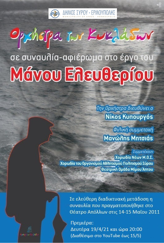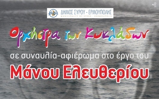 Η Ορχήστρα των Κυκλάδων, σε συνεργασία με το Γραφείο Πολιτισμού του Δήμου Σύρου - Ερμούπολης και με αφορμή τα 10 χρόνια από τη διεξαγωγή της συναυλίας – αφιέρωμα στο έργο του Μάνου Ελευθερίου, που πραγματοποιήθηκε στο Θέατρο Απόλλων της Σύρου στις 14 & 15/5/2011, μεταδίδει διαδικτυακά τη συναυλία με ελεύθερη πρόσβαση για το κοινό.
