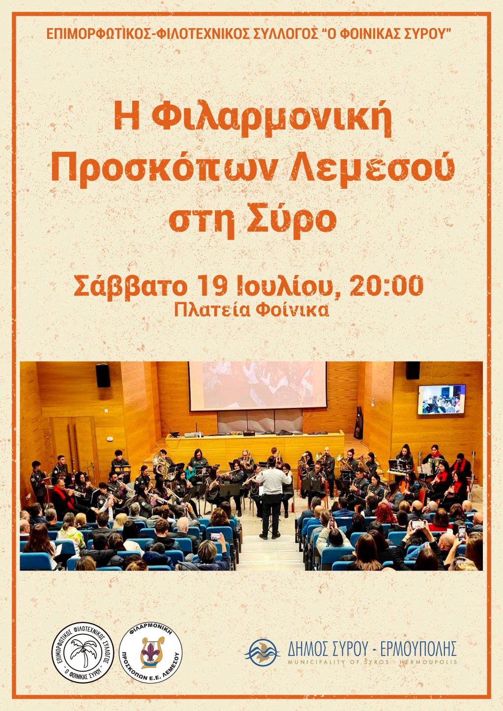 Η συναυλία που διεξάγεται από τον Επιμορφωτικό Φιλοτεχνικό Σύλλογο "Ο Φοίνικας Σύρου" και εντάσσεται στις πολιτιστικές εκδηλώσεις του Δήμου "Σύρος - Πολιτισμός 2025", θα πραγματοποιηθεί στην πλατεία του Φοίνικα, το Σάββατο 19 Ιουλίου στις 8 το βράδυ.