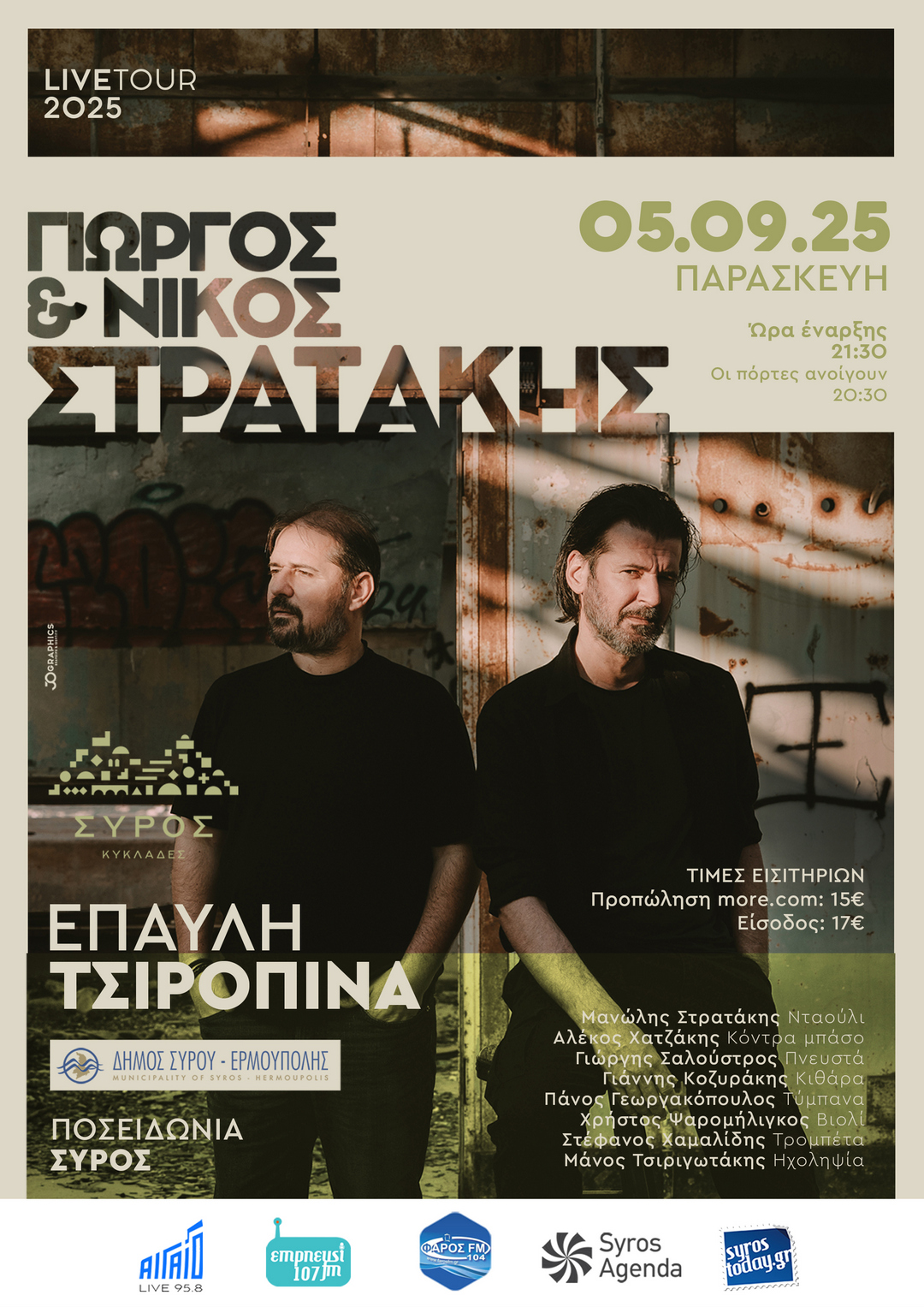 Την Παρασκευή 5 Σεπτεμβρίου, στις 21:30, η Έπαυλη Τσιροπινά στην Ποσειδωνία της Σύρου θα γεμίσει με τους ήχους της κρητικής παράδοσης και την ενέργεια δύο από τους σημαντικότερους εκπροσώπους της: του Γιώργου και του Νίκου Στρατάκη.