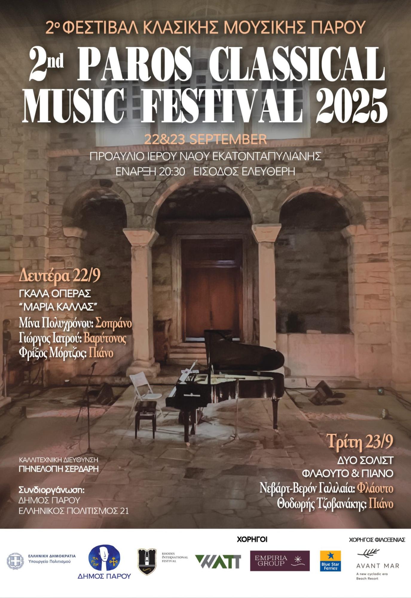 Τη Δευτέρα 22 και την Τρίτη 23 Σεπτεμβρίου, η Πάρος υποδέχεται στον προαύλειο χώρο της Εκατονταπυλιανής, το 2o Φεστιβάλ Κλασικής Μουσικής.