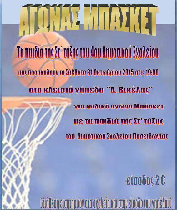 Τα παιδιά της ΣΤ’ Τάξης του 4ου Δημοτικού Σχολείου Ερμούπολης σας προσκαλούν το Σάββατο 31 Οκτωβρίου 2015 στις 19:00 στο κλειστό γήπεδο «Δημήτριος Βικέλας» για φιλικό αγώνα μπάσκετ με τους μαθητές της ΣΤ’ Τάξης του Δημοτικού Σχολείου Ποσειδωνίας.
