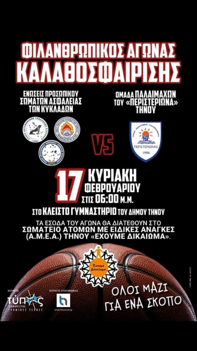 Την Κυριακή στις 17 Φεβρουαρίου στις 18:00 το απόγευμα θα πραγματοποιηθεί στο κλειστό γυμναστήριο της Τήνου, αγώνας φιλανθρωπικού χαρακτήρα μεταξύ των παικτών των Σωμάτων Ασφαλείας Νομού Κυκλάδων και των Παλαιμάχων του ΤΑΚ Περιστεριώνα.