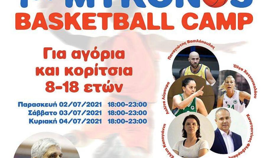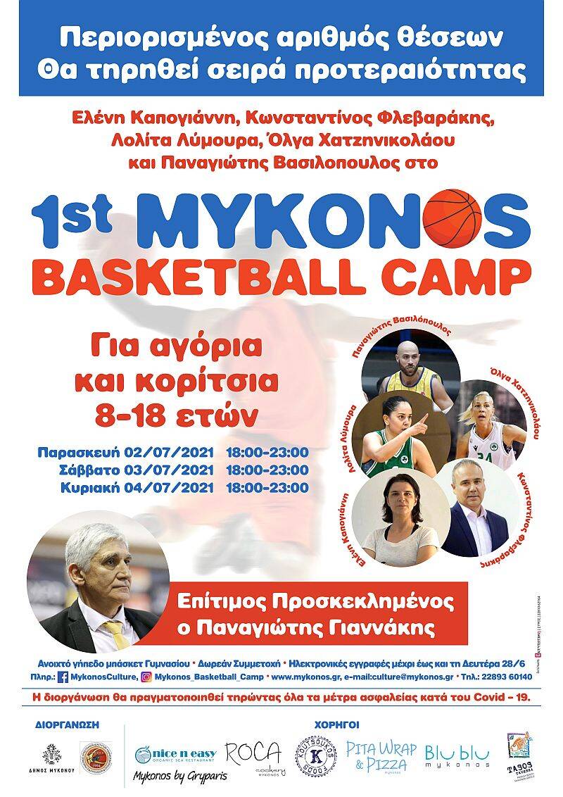 Σημαντικά πρόσωπα του Ελληνικού μπάσκετ αναμένεται να βρεθούν το τριήμερο 2-4 Ιουλίου στο νησί των ανέμων. Ο Δήμος Μυκόνου διοργανώνει το 1ο Basketball Camp για παιδιά από 8 έως 18 ετών. Όλοι οι συμμετέχοντες θα καταταχθούν σε γκρουπ ηλικίας αλλά και δυναμικότητας, που θα αναπτυχθούν κατά την διάρκεια του τριημέρου. Στο πρώτο τουρνουά μπάσκετ που θα διεξαχθεί από τον Δήμο Μυκόνου θα παραβρεθούν οι: Κωνσταντίνος Φλεβαράκης και Ελένη Καπογιάννη (προπονητές). Όπως επίσης οι: Παναγιώτης Βασιλόπουλος, Όλγα Χατζηνικολάου, Λολίτα Λύμουρα (αθλητές). Ενώ επίτιμος προσκεκλημένος είναι ο Παναγιώτης Γιαννάκης. Στόχος του CAMP είναι να δώσει την ευκαιρία στα παιδιά που ασχολούνται ή θα ήθελαν να ασχοληθούν με τον αθλητισμό να γνωρίσουν το μπάσκετ μέσα από τα μάτια καταξιωμένων αθλητών και προπονητών, που έχουν αφιερώσει την ζωή τους σε αυτό και να μοιραστούν μαζί τους γνώσεις και εμπειρίες. Τέλος, την περιγραφή του αγώνα της τελευταίας ημέρας με την εφηβική ομάδα του ΑΟ Μυκόνου θα την κάνει ο γνωστός δημοσιογράφος Βασίλης Σκουντής.