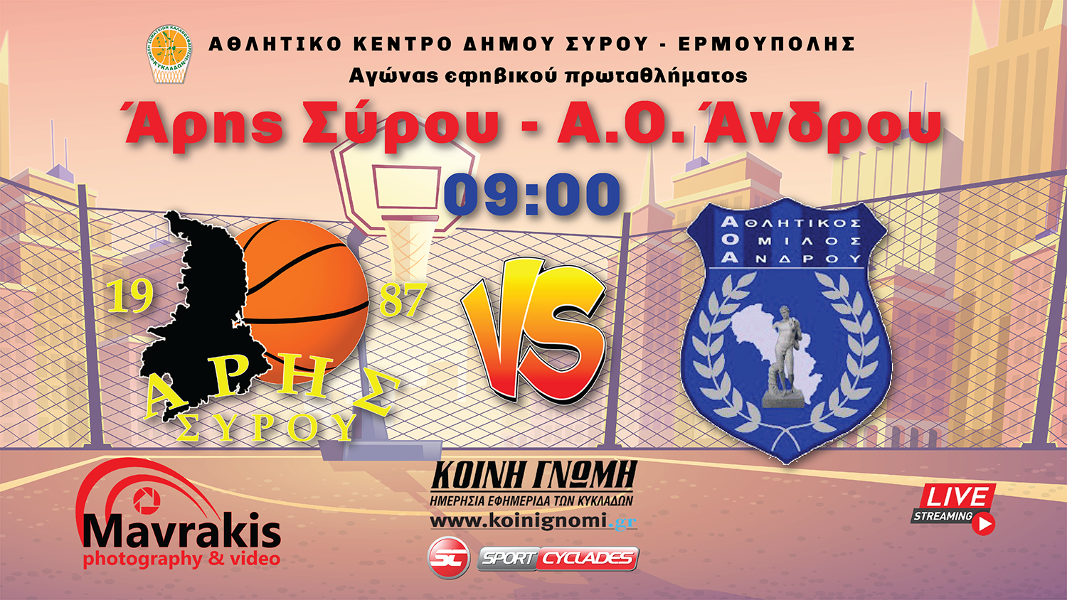 Παρακολουθήστε σε ζωντανή μετάδοση από το κλειστό γυμναστήριο της Σύρου τον αγώνα του πρωταθλήματος Εφήβων της ΕΣΚ Κυκλάδων μεταξύ του Άρη Σύρου και του ΑΟ Άνδρου. Το παιχνίδι θα ξεκινήσεις στις 09:00 το πρωί του Σαββάτου.