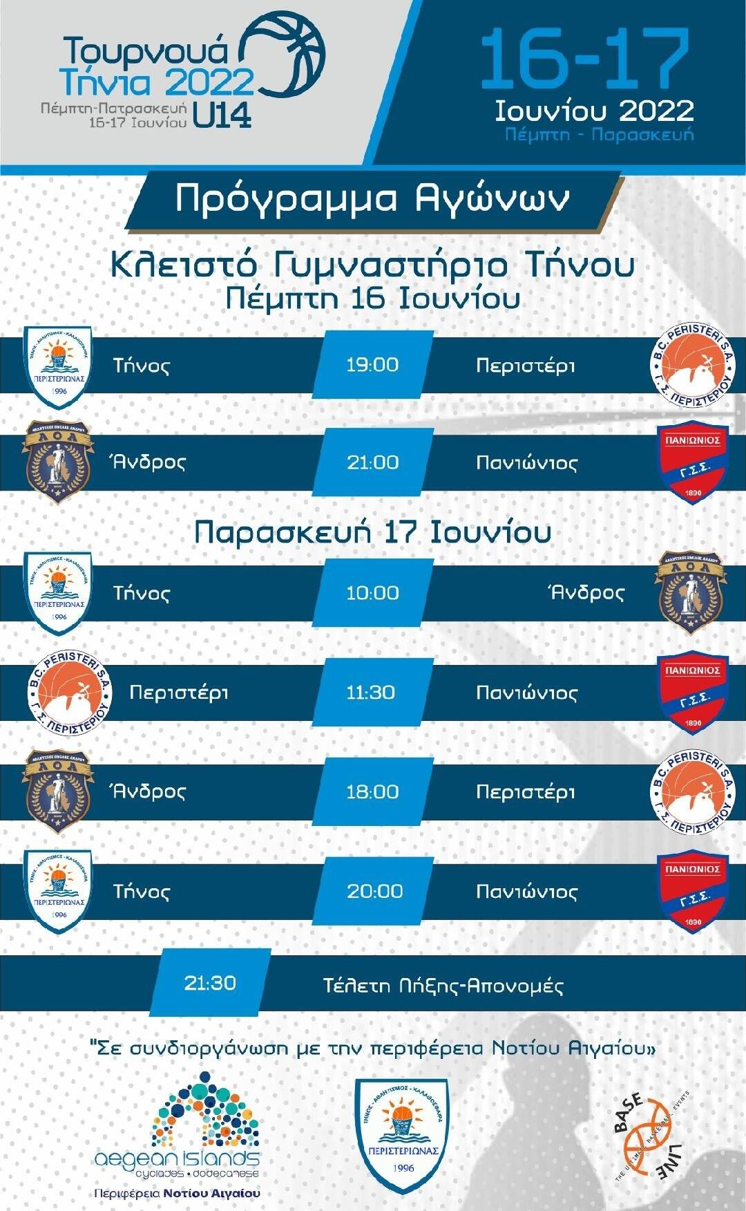 Η πρωταθλήτρια ομάδα του Περιστερίου μαζί με τον ιστορικό Πανιώνιο, την πάντα ανταγωνιστική ομάδα της γειτονικής Άνδρου και τον αγαπημένο μας Περιστεριώνα θα αναμετρηθούν μπασκετικά στην Τήνο σε ένα μοναδικό τριήμερο για αθλητές και θεατές.