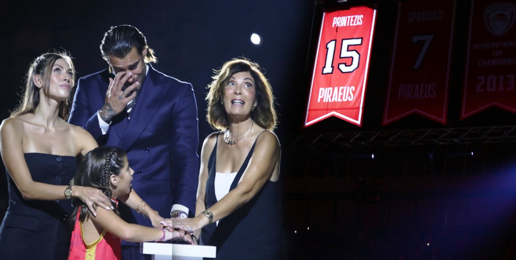 Ο άνθρωπος που πήγε στα 15 του στον Ολυμπιακό και έφυγε δις πρωταθλητής Ευρώπης δήλωσε ότι «νιώθω ο πιο ακριβοπληρωμένος παίκτης όλων των εποχών χάρη στην αγάπη σας» και κάλεσε τις γυναίκες της ζωής του στο παρκέ για να πατήσουν όλοι μαζί το κουμπί για να ανέβει η φανέλα.