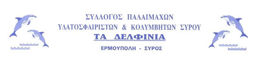 Ο Σύλλογος Παλαιμάχων Υδατοσφαιριστών και Κολυμβητών Σύρου “Τα Δελφίνια” ενημερώνει ότι το Σαββατοκύριακο 24 & 25 Ιουνίου διεξάγονται στο Κολυμβητήριο Ερμούπολης οι αγώνες Play out της Β’ Εθνικής Πόλο, που συμμετέχει η Ομάδα του ΝΟ Σύρου, η οποία χρειάζεται την παρουσία και συμπαράσταση όλων μας, για την επίτευξη του στόχου της, που δεν είναι άλλος από την παραμονή της στην Β΄ Εθνική .