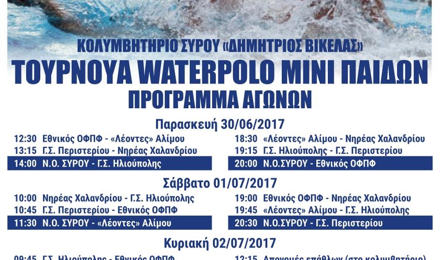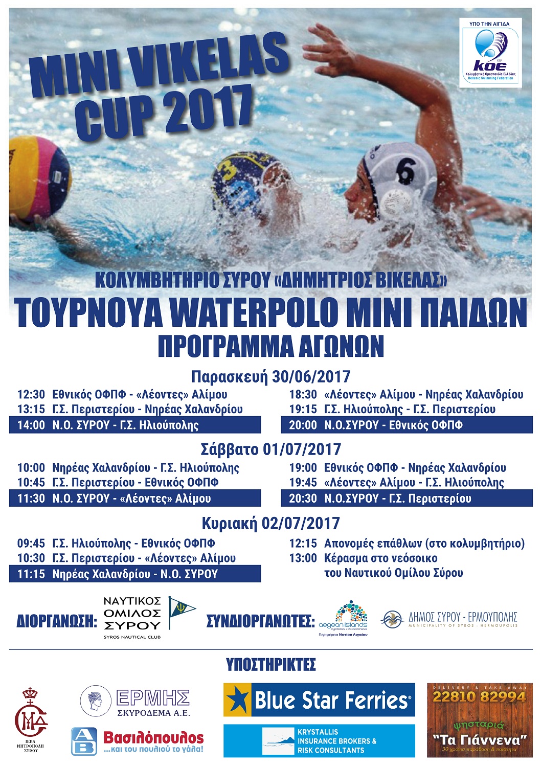 Από την Παρασκευή 30 Ιουνίου έως και την Κυριακή 2 Ιουλίου θα πραγματοποιηθεί το τουρνουά πόλο «mini Vikelas Cup 2017»