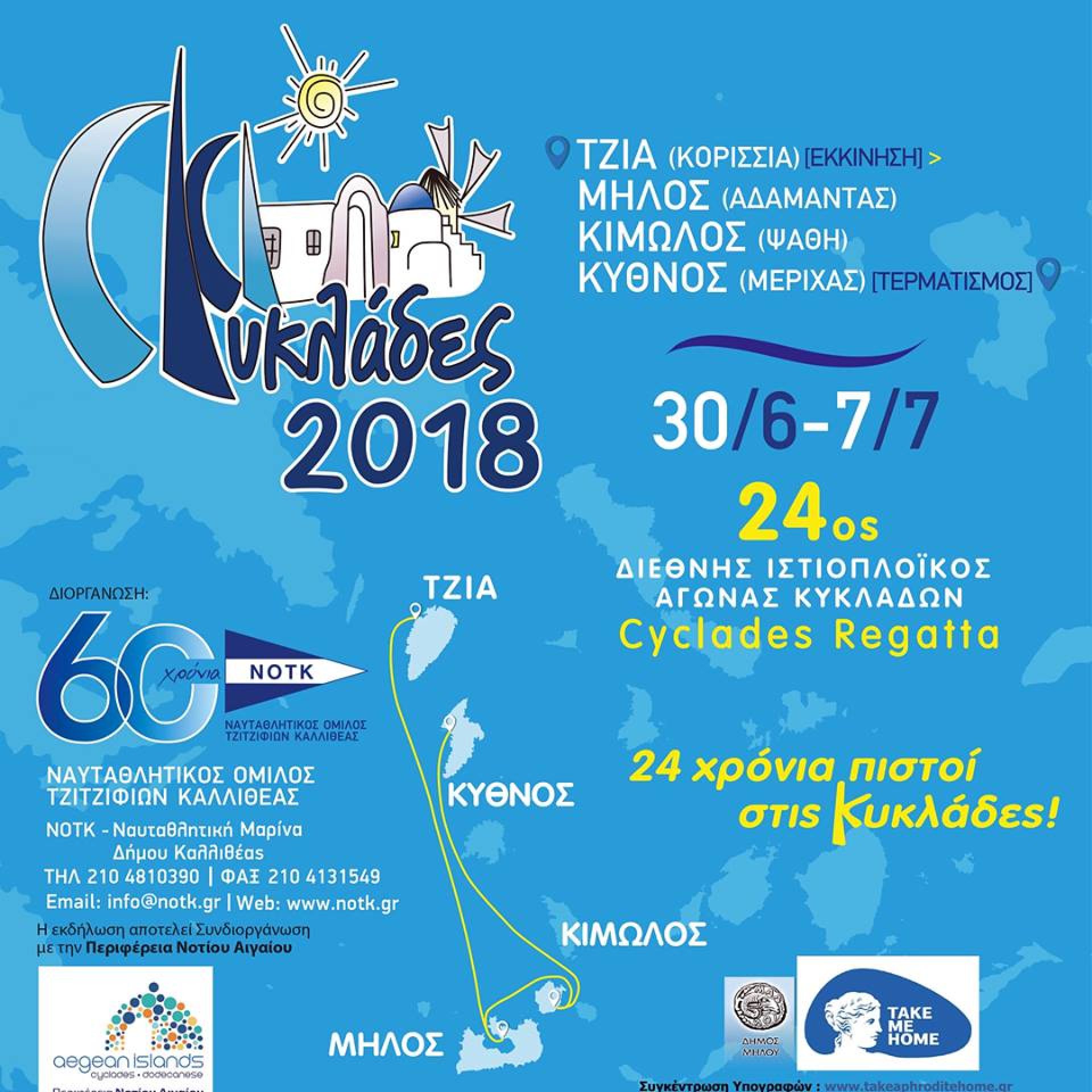 Από τις 30 Ιουνίου & έως 8 Ιουλίου 2018 θα πραγματοποιηθεί ο 24ος Διεθνής Ιστιοπλοϊκός Αγώνας ΚΥΚΛΑΔΕΣ 2018 "CYCLADES REGATTA", ο οποίος εντάσσεται στο επίσημο πρόγραμμα αγώνων Ανοικτής Θάλασσας της Ελληνικής Ιστιοπλοϊκής Ομοσπονδίας (Ε.Ι.Ο.).
