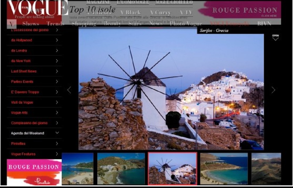 Ανάμεσα στους κορυφαίους προορισμούς για τους Ιταλούς, συγκαταλέγονται τα νησιά Σέριφος, Φολέγανδρος και Θηρασιά, σύμφωνα με την ιταλική έκδοση της Vogue. Τα τρία νησιά των Κυκλάδων "ποζάρουν" στις σελίδες του περιοδικού και προβάλλονται με ιδιαίτερα κολακευτικά λόγια.