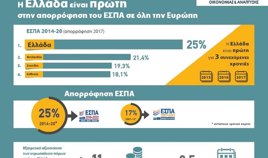 Συγκεκριμένα η Ελλάδα βρέθηκε στην πρώτη θέση απορρόφησης του ΕΣΠΑ 2014 - 2020 τις χρονιές 2015, 2016, 2017, ενώ το ποσοστό της για τη χρονιά που φεύγει αγγίζει το 25%, με δεύτερη τη Φιλανδία με 21,4%, ενώ ακολουθούν Σουηδία και Εσθονία με 19,3% και 18,1% αντίστοιχα. Σημειώνεται επίσης ότι στο αντίστοιχο χρονικό σημείο για το ΕΣΠΑ 2007 – 2013 το ποσοστό απορρόφησης της χώρας ήταν μόλις 17%, δηλαδή 8 μονάδες κάτω από το τωρινό.