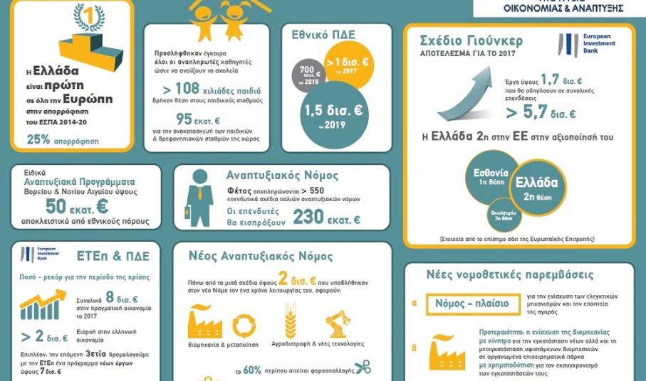 Συγκεκριμένα, όπως αναφέρει το Υπουργείο Ανάπτυξης, το 2017 προσλήφθηκαν έγκαιρα όλοι οι αναπληρωτές καθηγητές ώστε να ανοίξουν τα σχολεία, 108.000 χιλιάδες παιδιά βρήκαν θέση στους παιδικούς σταθμούς ενώ δαπανήθηκαν 95 εκατομμύρια ευρώ για την ανακατασκευή των βρεφονηπιακών και παιδικών σταθμών της χώρας. Παράλληλα το εθνικό Πρόγραμμα Δημοσίων Επενδύσεων (ΠΔΕ) από 700 εκατομμύρια ευρώ το 2015, υπερέβη το 1 δισεκατομμύριο ευρώ για το 2017, ενώ αναμένεται να φτάσει το 1,5 δισεκατομμύριο ευρώ το 2019.