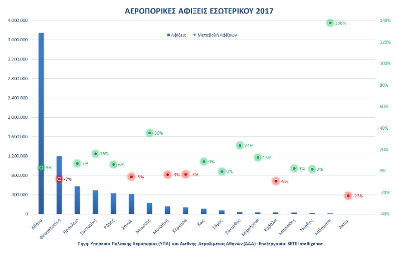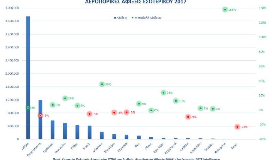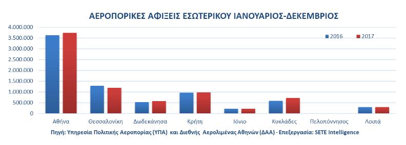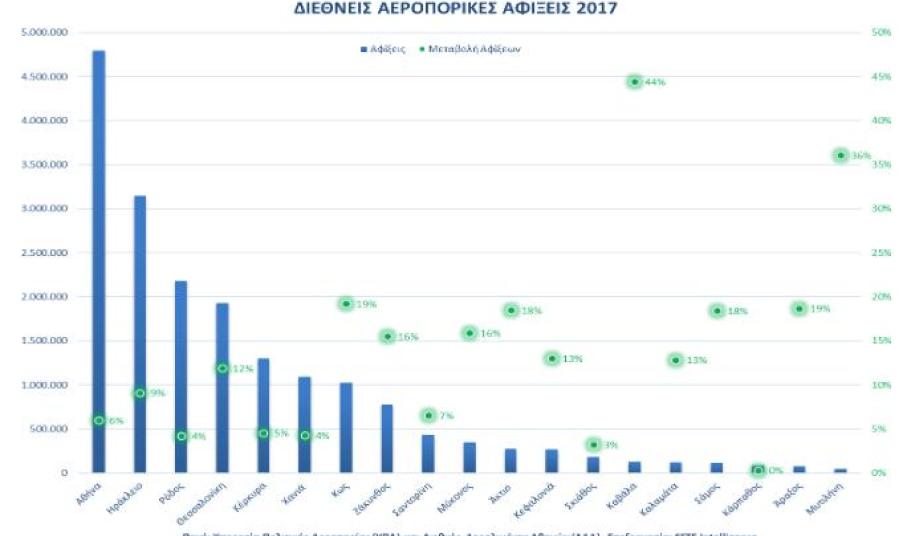 Αύξηση +2,8% των αεροπορικών αφίξεων παρατηρήθηκε συνολικά την περίοδο Ιανουαρίου-Δεκεμβρίου του 2017, σε σχέση με την αντίστοιχη περίοδο του 2016. Συγκεκριμένα καταγράφηκαν 7,8 εκατ. αεροπορικές αφίξεις έναντι 7,5 εκατ. το 2016.