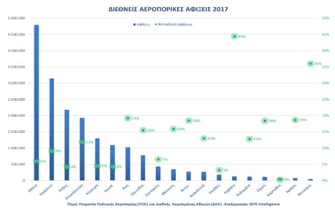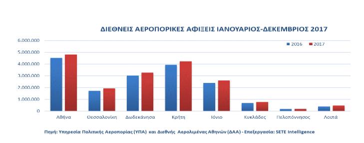 Αύξηση +8,6% των διεθνών αεροπορικών αφίξεων παρατηρήθηκε συνολικά την περίοδο Ιανουαρίου-Δεκεμβρίου του 2017 σε σχέση με την αντίστοιχη περίοδο του 2016. Συγκεκριμένα καταγράφηκαν 18,3 εκατ. αεροπορικές αφίξεις έναντι 16,9 εκατ. το 2016.