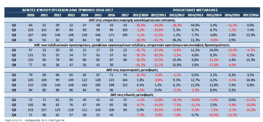 Ο ΔΚΕ των αεροπορικών μεταφορών, παρουσίασε αύξηση +6,8% σε σχέση με το αντίστοιχο τρίμηνο πέρυσι. Αντίθετα, σημαντικά χαμηλότερα από τα υψηλά επίπεδα του 2010 βρίσκονται ο ΔΚΕ των πλωτών μεταφορών παρουσιάζοντας το χαμηλότερο ιστορικό για το Γ’ τρίμηνο την περίοδο 2010-2017.