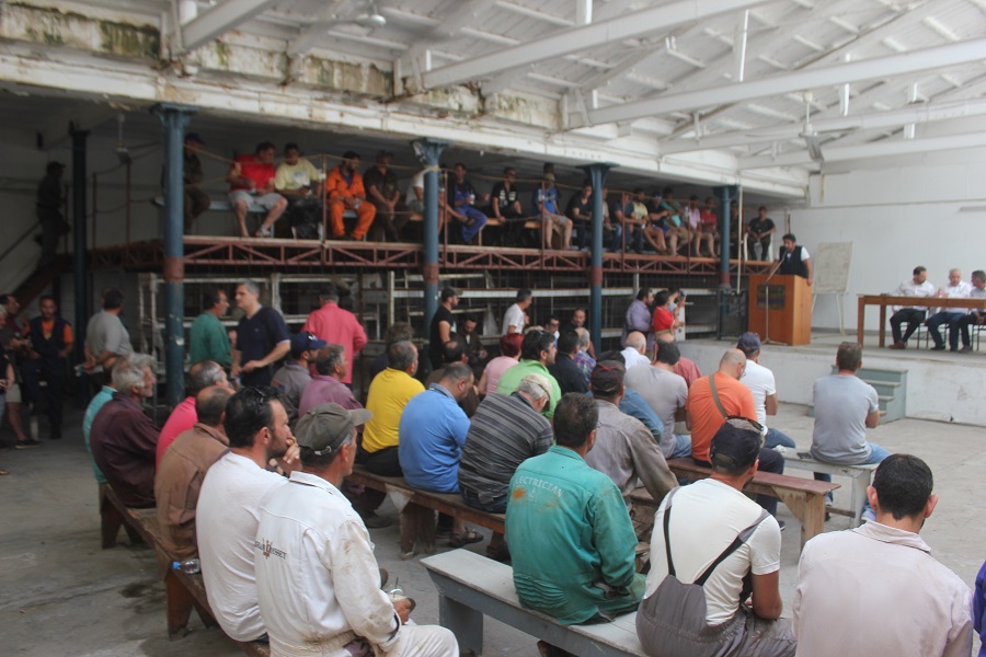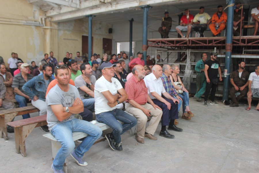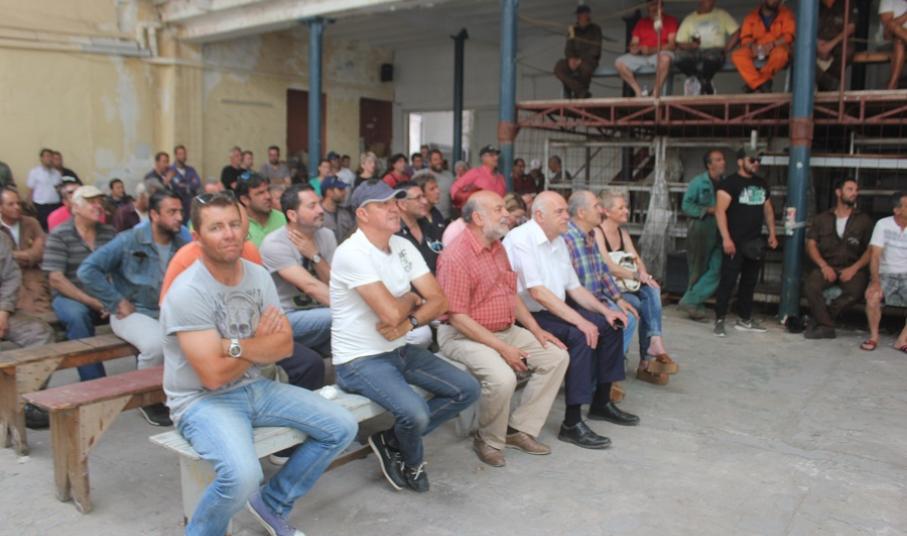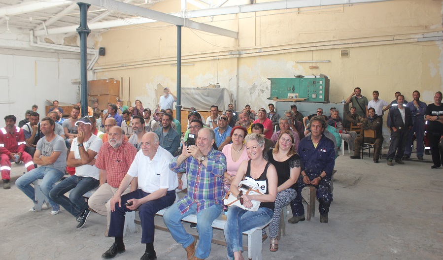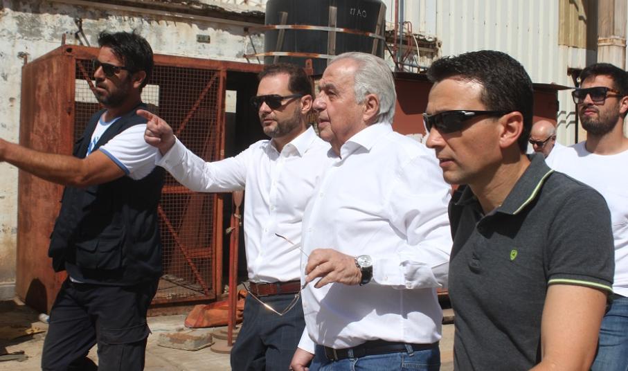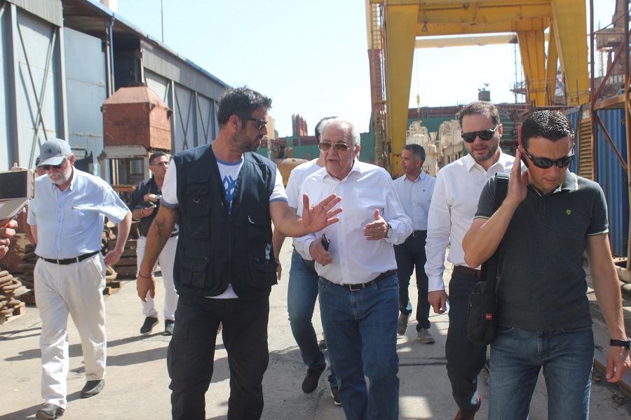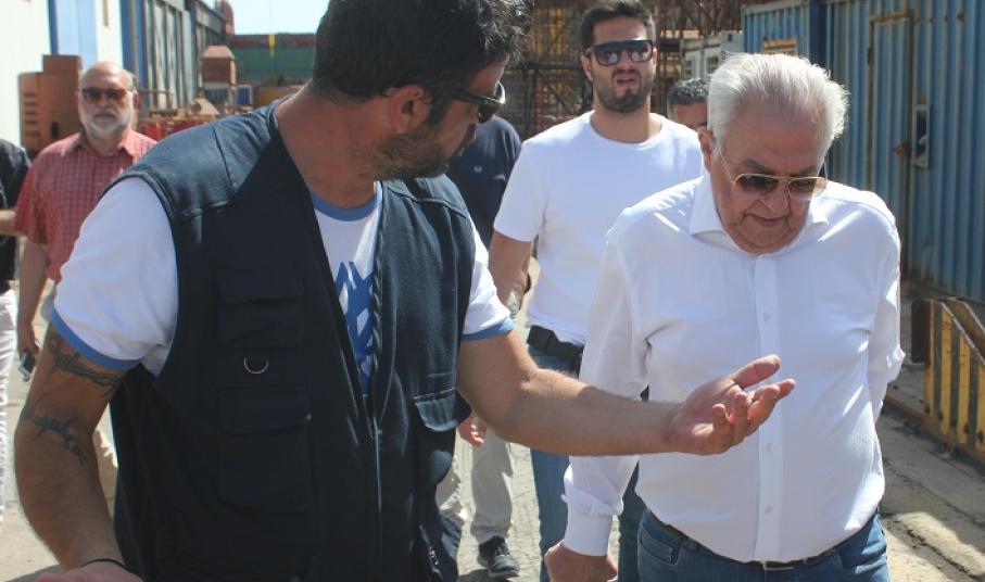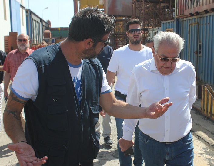 Αμέσως μετά την άφιξή του, ο κ. Φλαμπουράρης συνομίλησε σύντομα με τον πρόεδρο και τον γραμματέα του Εργοστασιακού Σωματείου, Αντώνη Χατζαντώνη και Μάρκο Ρηγούτσο, αντίστοιχα, όπως παρομοίως και με τον κ. Ξενοκώστα, οι οποίοι από κοινού τον ξενάγησαν στις εγκαταστάσεις του Νεωρίου καθώς και στη δεξαμενή “Βιολαντώ Ν. Γουλανδρή”.