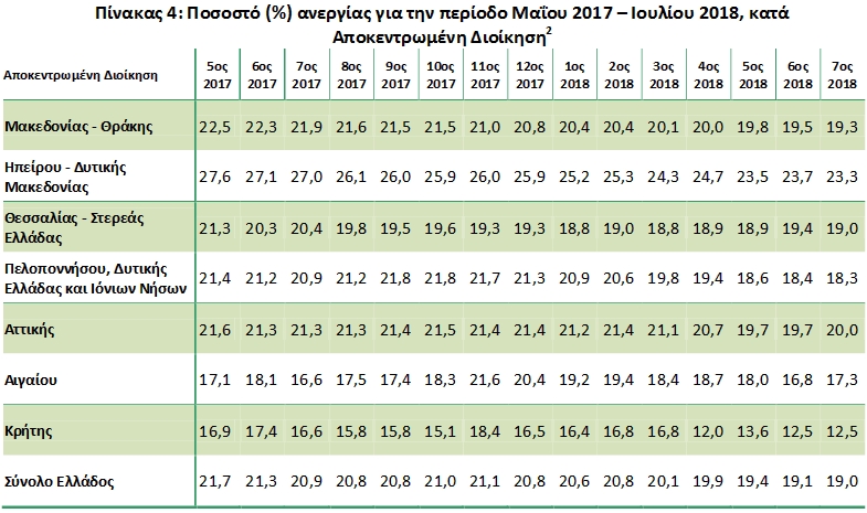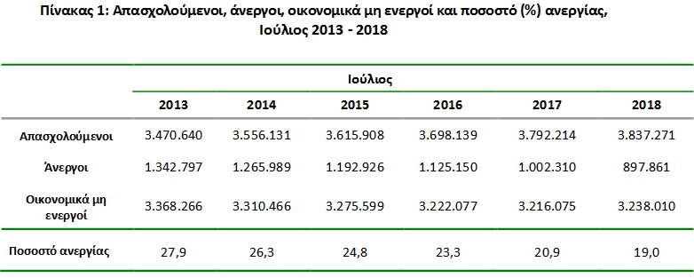 Το εποχικά διορθωμένο ποσοστό ανεργίας τον Ιούλιο του 2018 ανήλθε σε 19,0% έναντι 20,9% τον Ιούλιο του 2017 και 19,1% τον Ιούνιο του 2018. Το σύνολο των απασχολουμένων, κατά τον Ιούλιο του 2018, εκτιμάται ότι ανήλθε σε 3.837.271 άτομα. Οι άνεργοι ανήλθαν σε 897.861 άτομα ενώ ο οικονομικά μη ενεργός πληθυσμός ανήλθε σε 3.238.010 άτομα.
