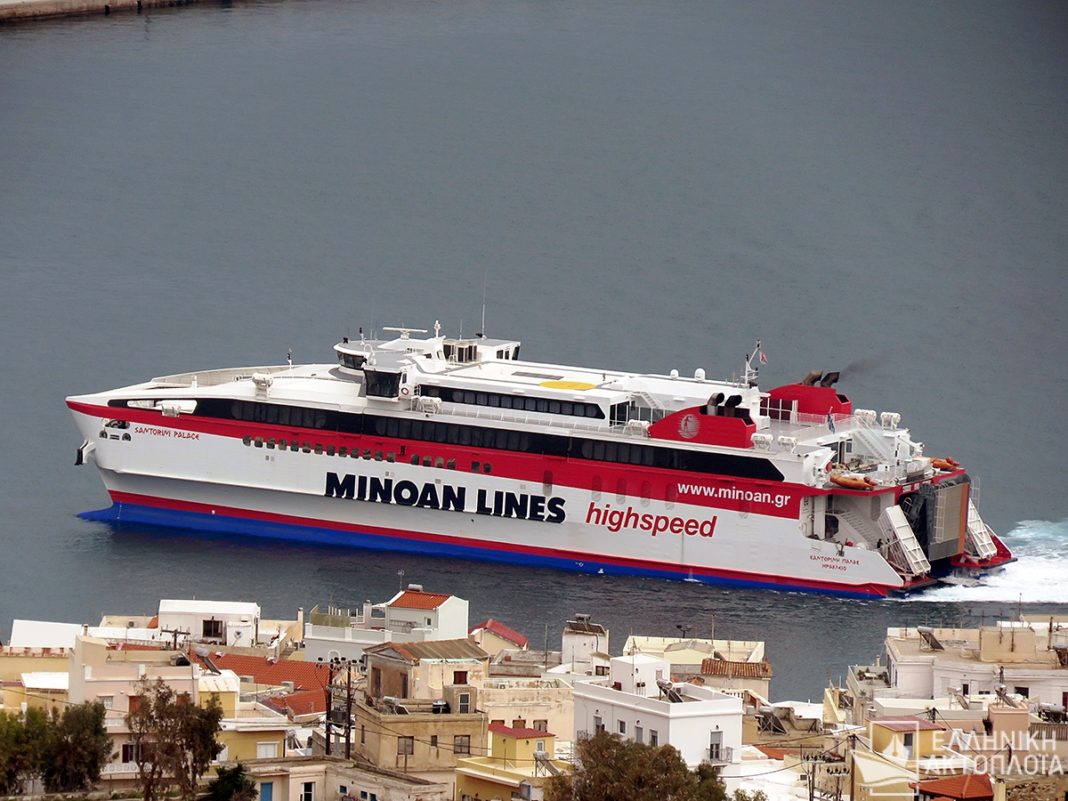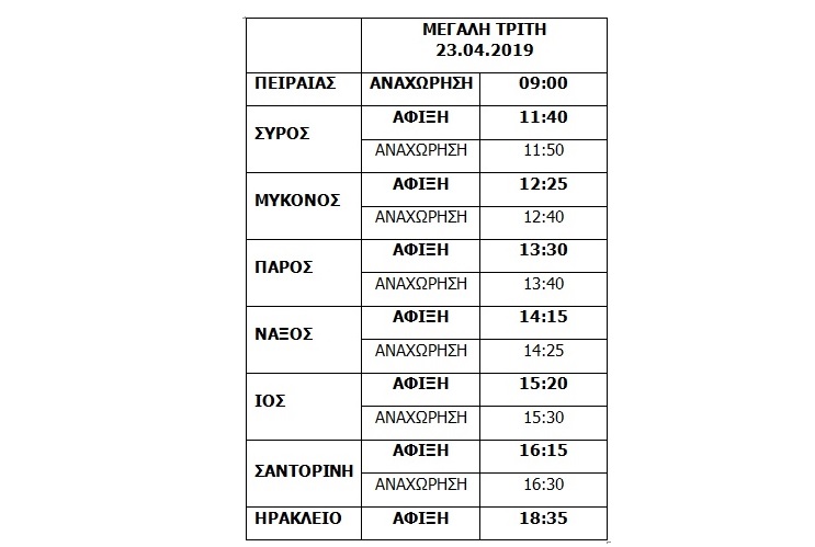 Οι Μινωικές Γραμμές γνωστοποιούν στο επιβατικό κοινό ότι την Μ. Τρίτη 23 Απριλίου 2019, το υπερσύγχρονο High Speed Catamaran SANTORINI PALACE θα πραγματοποιήσει έκτακτο δρομολόγιο με αναχώρηση από το λιμάνι του Πειραιά και με τελικό προορισμό το λιμάνι του Ηρακλείου, εκτελώντας τη γραμμή Πειραιάς-Σύρος-Μύκονος-Πάρος-Νάξος-Ίος-Σαντορίνη-Ηράκλειο, σύμφωνα με το παρακάτω πρόγραμμα (βλ. πίνακα).