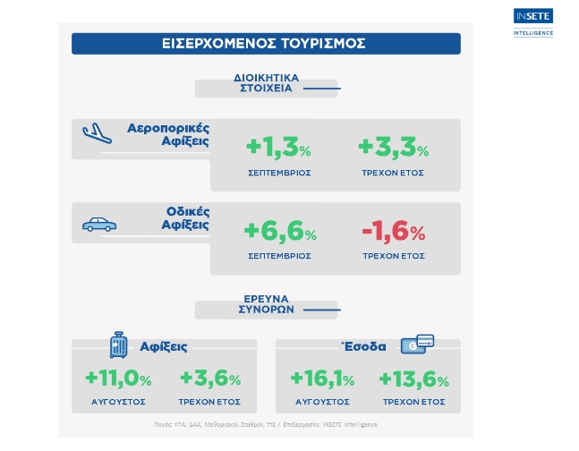 Σύμφωνα με τα διαθέσιμα στοιχεία από τα κυριότερα αεροδρόμια της χώρας, οι διεθνείς αεροπορικές αφίξεις που καταγράφηκαν τον Σεπτέμβριο του 2019, ήταν αυξημένες κατά +1,3%/+39 χιλ. σε σχέση με τον Σεπτέμβριο του 2018, ενώ συνολικά καταγράφηκαν 3,1 εκατ. διεθνείς αεροπορικές αφίξεις.