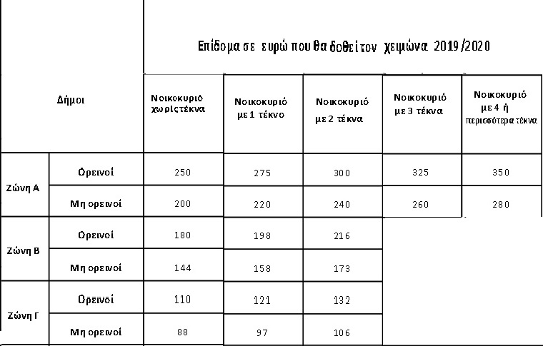 Πιο συγκεκριμένα πέρυσι είχε δοθεί επίδομα ύψους 0,16 ευρώ ανά λίτρο πετρελαίου εσωτερικής καύσης θέρμανσης και υπήρχαν συγκεκριμένα όρια κατανάλωσης με βάση τα τετραγωνικά της κατοικίας και την γεωγραφική ζώνη.