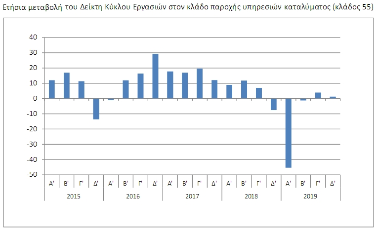 Ο Δείκτης Κύκλου Εργασιών στον κλάδο 55 του Δ ́ τριμήνου 2019, σε σύγκριση με τον αντίστοιχο δείκτη του Γ ́ τριμήνου 2019, παρουσίασε μείωση 80,3% έναντι μείωσης 79,7%, που σημειώθηκε κατά τη σύγκριση της αντίστοιχης περιόδου