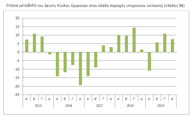 Ο Γενικός Δείκτης Κύκλου Εργασιών (κλάδοι 55 και 56) για το Δ ́ τρίμηνο του 2019 σε σύγκριση με τον αντίστοιχο δείκτη του Δ ́ τριμήνου 2018, παρουσίασε αύξηση 4,8% έναντι μείωσης 2,8%, που σημειώθηκε κατά τη σύγκριση της αντίστοιχης περιόδου του έτους 2018 προς το 2017.