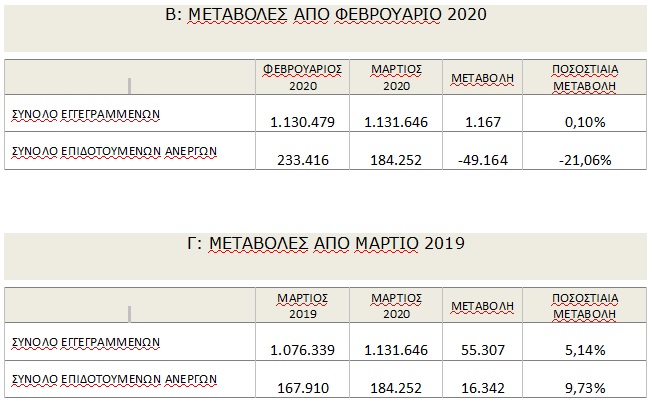 Το σύνολο των εγγεγραμμένων ανέργων, με κριτήριο την αναζήτηση εργασίας (αναζητούντων εργασία), για τον μήνα Μάρτιο 2020, ανήλθε σε 1.071.409 άτομα. Από αυτά 515.933 (ποσοστό 48,15%) είναι εγγεγραμμένα στο μητρώο του ΟΑΕΔ για χρονικό διάστημα ίσο ή και περισσότερο των 12 μηνών και 555.476 (ποσοστό 51,85%) είναι εγγεγραμμένα στο μητρώο του ΟΑΕΔ για χρονικό διάστημα μικρότερο των 12 μηνών. Οι άνδρες ανέρχονται σε 397.228 (ποσοστό 37,08%) και οι γυναίκες ανέρχονται σε 674.181 (ποσοστό 62,92%).